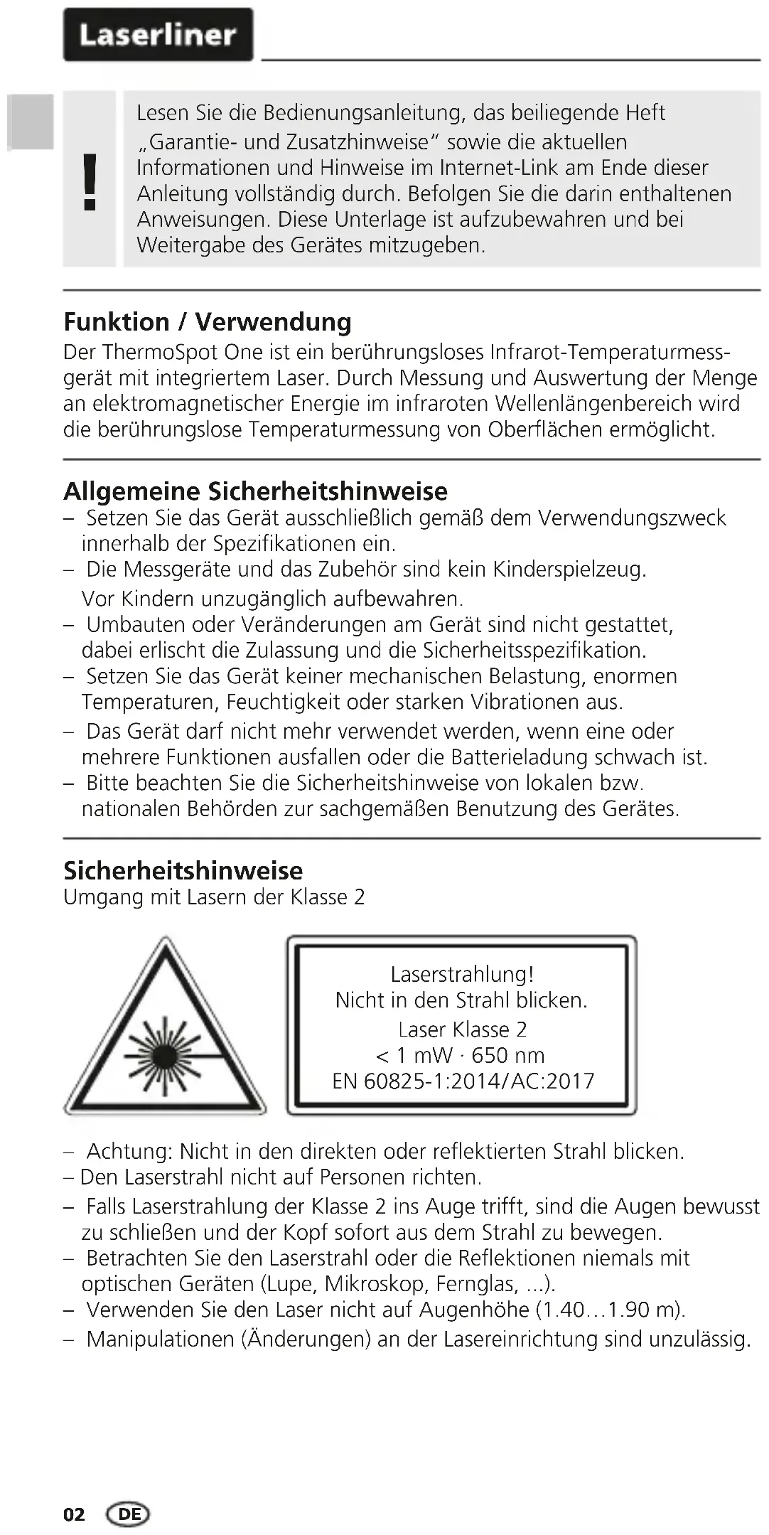 ThermoSpot One Laser 650 nm Laser-Focus 12 m Laser-Focus ø 1 m 12:102 – Achtung: Nicht in den direkten oder reektierten Strahl blicken. – Den Laserstrahl nicht auf Personen richten. – Falls Laserstrahlung der Klasse 2 ins Auge trifft, sind die Augen bewusst zu schließen und der Kopf sofort aus dem Strahl zu bewegen. – Betrachten Sie den Laserstrahl oder die Reektionen niemals mit optischen Geräten (Lupe, Mikroskop, Fernglas, ...). – Verwenden Sie den Laser nicht auf Augenhöhe (1.40…1.90 m). – Manipulationen (Änderungen) an der Lasereinrichtung sind unzulässig. Sicherheitshinweise Umgang mit Lasern der Klasse 2 Allgemeine Sicherheitshinweise – Setzen Sie das Gerät ausschließlich gemäß dem Verwendungszweck innerhalb der Spezikationen ein. – Die Messgeräte und das Zubehör sind kein Kinderspielzeug. Vor Kindern unzugänglich aufbewahren. – Umbauten oder Veränderungen am Gerät sind nicht gestattet, dabei erlischt die Zulassung und die Sicherheitsspezikation. – Setzen Sie das Gerät keiner mechanischen Belastung, enormen Temperaturen, Feuchtigkeit oder starken Vibrationen aus. – Das Gerät darf nicht mehr verwendet werden, wenn eine oder mehrere Funktionen ausfallen oder die Batterieladung schwach ist. – Bitte beachten Sie die Sicherheitshinweise von lokalen bzw. nationalen Behörden zur sachgemäßen Benutzung des Gerätes. Funktion / Verwendung Der ThermoSpot One ist ein berührungsloses Infrarot-Temperaturmess- gerät mit integriertem Laser. Durch Messung und Auswertung der Menge an elektromagnetischer Energie im infraroten Wellenlängenbereich wird die berührungslose Temperaturmessung von Oberächen ermöglicht. Lesen Sie die Bedienungsanleitung, das beiliegende Heft „Garantie- und Zusatzhinweise“ sowie die aktuellen Informationen und Hinweise im Internet-Link am Ende dieser Anleitung vollständig durch. Befolgen Sie die darin enthaltenen Anweisungen. Diese Unterlage ist aufzubewahren und bei Weitergabe des Gerätes mitzugeben.