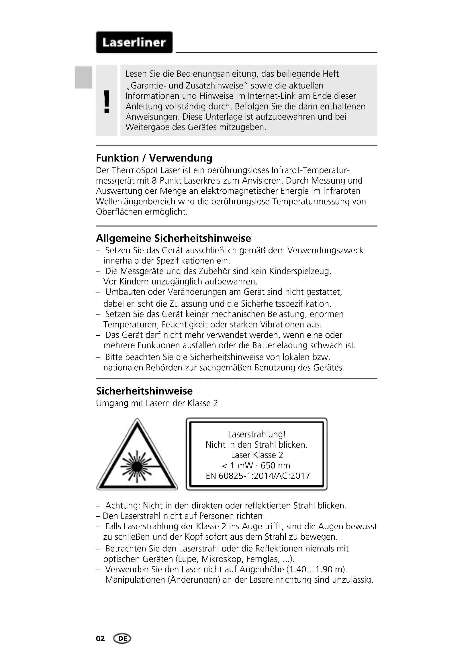 Auf korrekte Polarität achten. DE04 Hinweise zum Messvorgang Dieses Infrarot-Temperatur Messgerät ermittelt die Temperatur verschie- denster Oberächen und Materialien. Der integrierte Sensormesskopf empfängt die Infrarot-Strahlung, die jeder Körper materialspezisch abgibt. Der Grad der Abstrahlung wird durch den Emissionsgrad bestimmt (0-1). Das Gerät ist auf einen Emissionsgrad von 0,95 fest eingestellt, was für die meisten organischen Stoffe, sowie Kunststoffe, Keramik, Holz, Gummi und Gestein zutreffend ist. Beachten Sie, dass der Messbereich zwischen Gerät und Oberäche frei von Störgrößen ist (Dampf, Gas, Schmutz, Glas). Rev22W04ThermoSpot Laser650 nmEN 60825-1:2014/AC:2017A quality product from GmbH & Co. KGDonnerfeld 2, 59757 Arnsberg, Germany, Tel: +49 2932 638-300 Fax: -333, www.laserliner.com Rev22W04ThermoSpot Laser 650 nm EN 60825-1:2014/AC:2017 A quality product from GmbH & Co. KG Donnerfeld 2, 59757 Arnsberg, Germany, Tel: +49 2932 638-300 Fax: -333, www.laserliner.com Laseraustritt Laserwarnhinweis