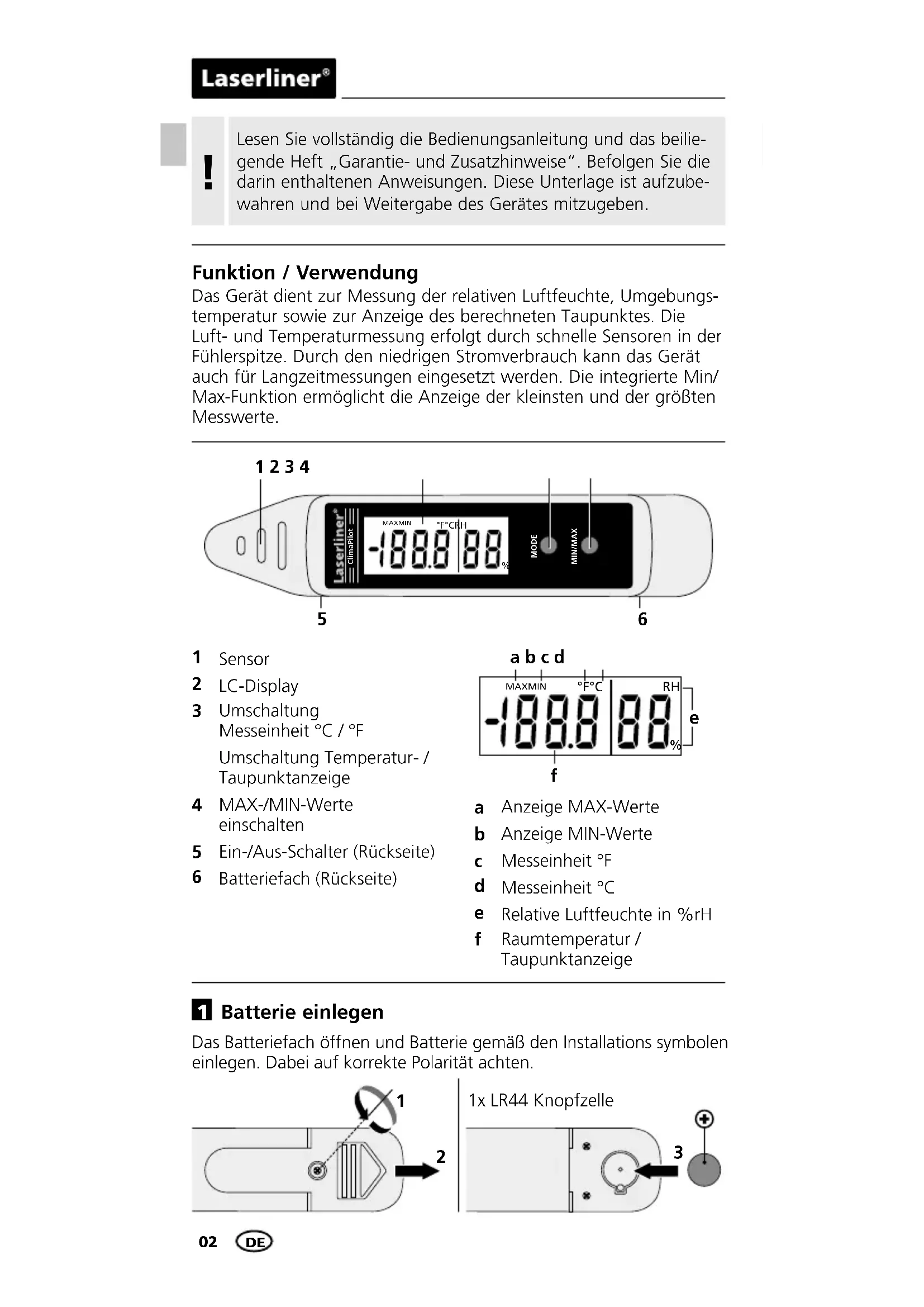 Batterie einlegen Das Batteriefach öffnen und Batterie gemäß den Installations symbolen einlegen. Dabei auf korrekte Polarität achten. 1x LR44 Knopfzelle DEClimaPilot