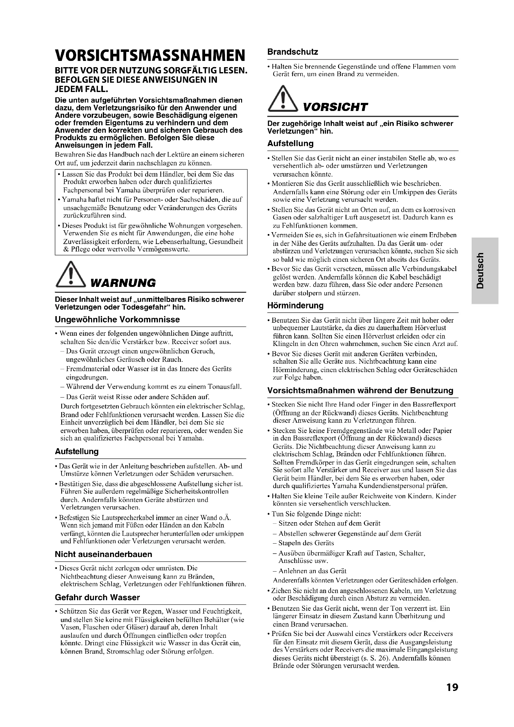 - Wenn eines der folgenden ungewöhnlichen Dinge auftritt, schalten Sie den/die Verstärker bzw. Receiver sofort aus. – Das Gerät erzeugt einen ungewöhnlichen Geruch, ungewöhnliches Geräusch oder Rauch. – Fremdmaterial oder Wasser ist in das Innere des Geräts eingedrungen. – Während der Verwendung kommt es zu einem Tonausfall. – Das Gerät weist Risse oder andere Schäden auf. Durch fortgesetzten Gebrauch könnten ein elektrischer Schlag, Brand oder Fehlfunktionen verursacht werden. Lassen Sie die Einheit unverzüglich bei dem Händler, bei dem Sie sie erworben haben, überprüfen oder reparieren, oder wenden Sie sich an qualifiziertes Fachpersonal bei Yamaha. Aufstellung