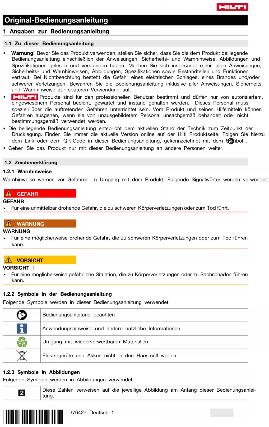 1.2.2 Symbole in der Bedienungsanleitung