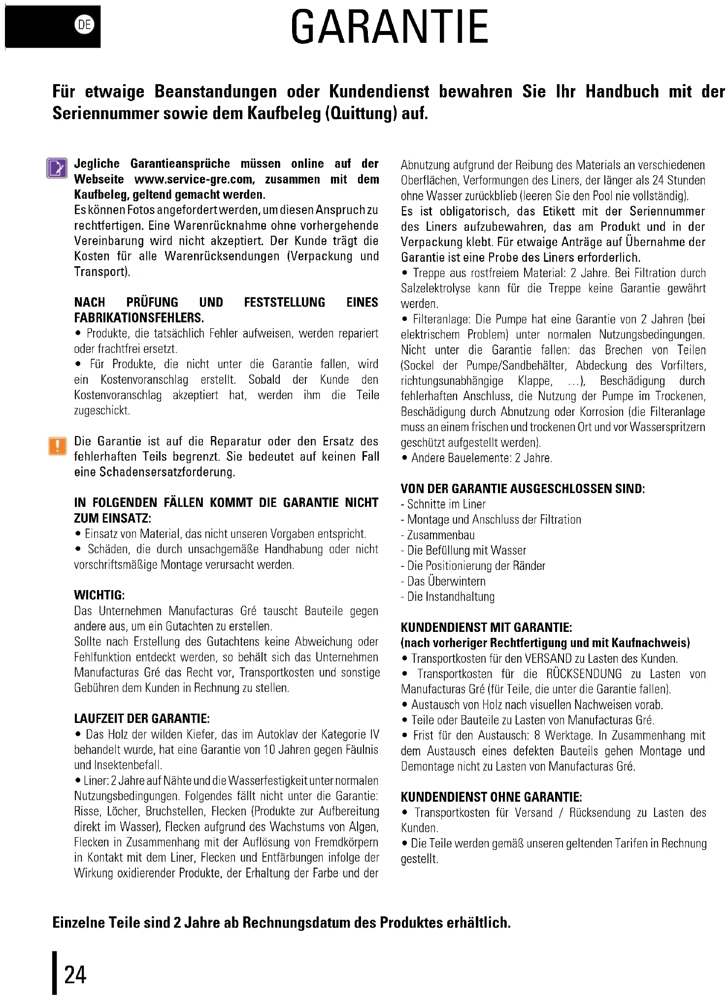 - Andere Bauelemente: 2 Jahre. VON DER GARANTIE AUSGESCHLOSSEN SIND: - Schnitte im Liner - Montage und Anschluss der Filtration - Zusammenbau - Die Befüllung mit Wasser - Die Positionierung der Ränder - Das Überwintern - Die Instandhaltung KUNDENDIENST MIT GARANTIE: (nach vorheriger Rechtfertigung und mit Kaufnachweis)