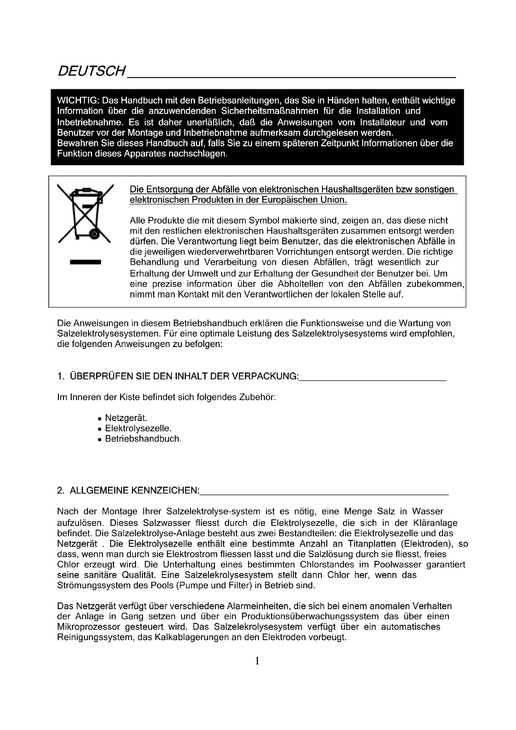Die Entsorgung der Abfälle von elektronischen Haushaltsgeräten bzw sonstigen elektronischen Produkten in der Europäischen Union. Alle Produkte die mit diesem Symbol makierte sind, zeigen an, das diese nicht mit den restlichen elektronischen Haushaltsgeräten zusammen entsorgt werden dürfen. Die Verantwortung liegt beim Benutzer, das die elektronischen Abfälle in die jeweiligen wiederverwehrtbaren Vorrichtungen entsorgt werden. Die richtige Behandlung und Verarbeitung von diesen Abfällen, trägt wesentlich zur Erhaltung der Umwelt und zur Erhaltung der Gesundheit der Benutzer bei. Um eine prezise information über die Abholtellen von den Abfällen zubekommen, nimmt man Kontakt mit den Verantwortlichen der lokalen Stelle auf. Die Anweisungen in diesem Betriebshandbuch erklären die Funktionsweise und die Wartung von Salzelektrolysesystemen. Für eine optimale Leistung des Salzelektrolysesystems wird empfohlen, die folgenden Anweisungen zu befolgen: