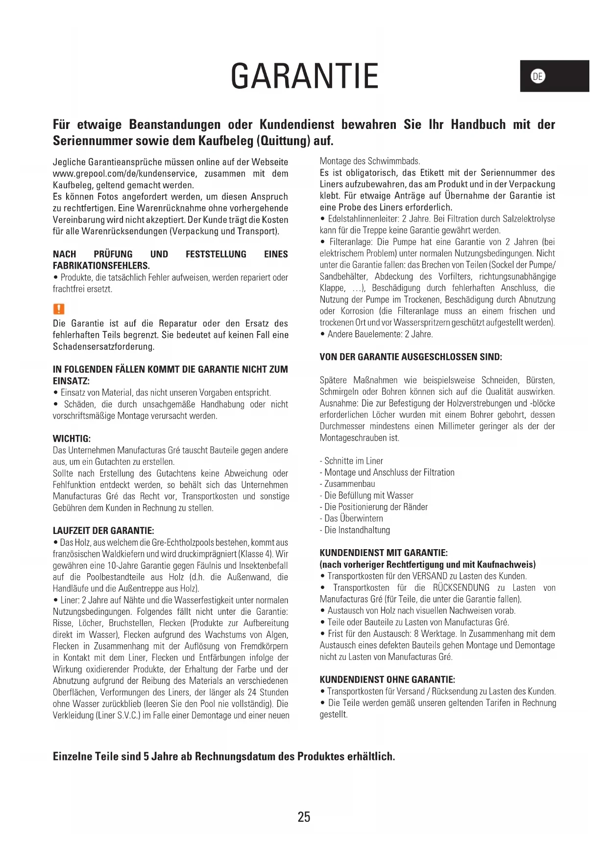 GARANTIE Für etwaige Beanstandungen oder Kundendienst bewahren Sie Ihr Handbuch mit der Seriennummer sowie dem Kaufbeleg (Quittung) auf. Einzelne Teile sind 5 Jahre ab Rechnungsdatum des Produktes erhältlich. Jegliche Garantieansprüche müssen online auf der Webseite www.grepool.com/de/kundenservice, zusammen mit dem Kaufbeleg, geltend gemacht werden. Es können Fotos angefordert werden, um diesen Anspruch zu rechtfertigen. Eine Warenrücknahme ohne vorhergehende Vereinbarung wird nicht akzeptiert. Der Kunde trägt die Kosten für alle Warenrücksendungen (Verpackung und Transport).