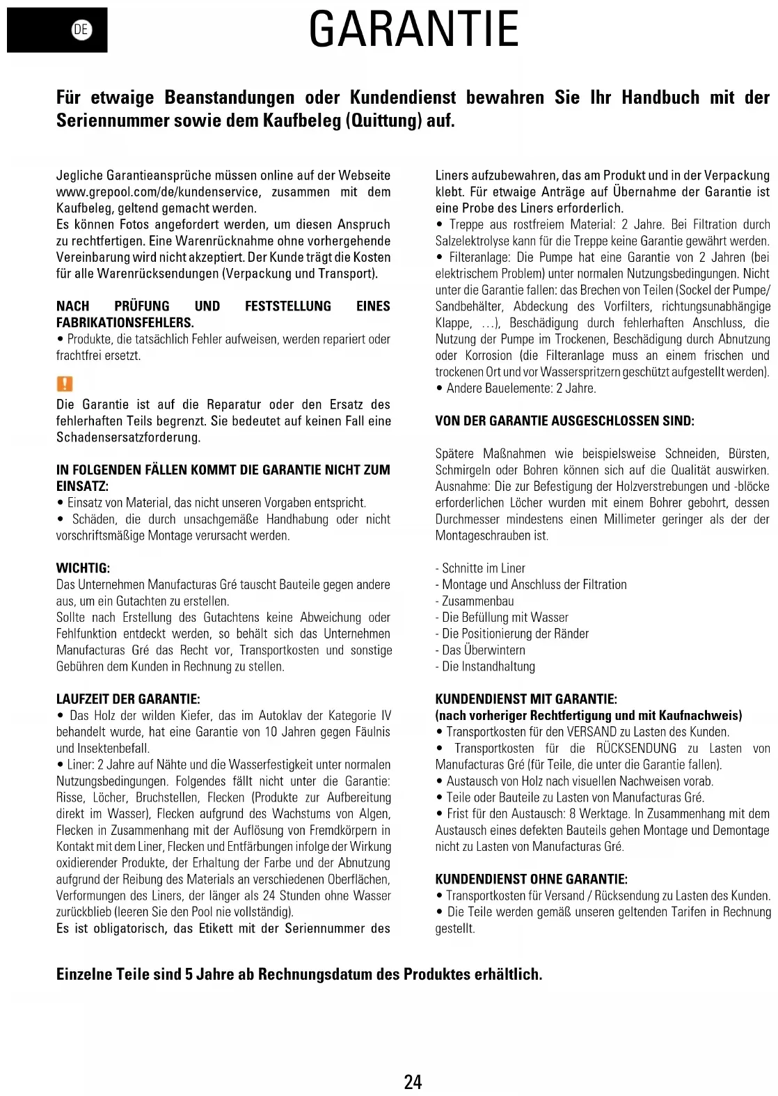 GARANTIE Für etwaige Beanstandungen oder Kundendienst bewahren Sie Ihr Handbuch mit der Seriennummer sowie dem Kaufbeleg (Quittung) auf. Jegliche Garantieansprüche müssen online auf der Webseite www.grepool.com/de/kundenservice, zusammen mit dem Kaufbeleg, geltend gemacht werden. Es können Fotos angefordert werden, um diesen Anspruch zu rechtfertigen. Eine Warenrücknahme ohne vorhergehende Vereinbarung wird nicht akzeptiert. Der Kunde trägt die Kosten für alle Warenrücksendungen (Verpackung und Transport).