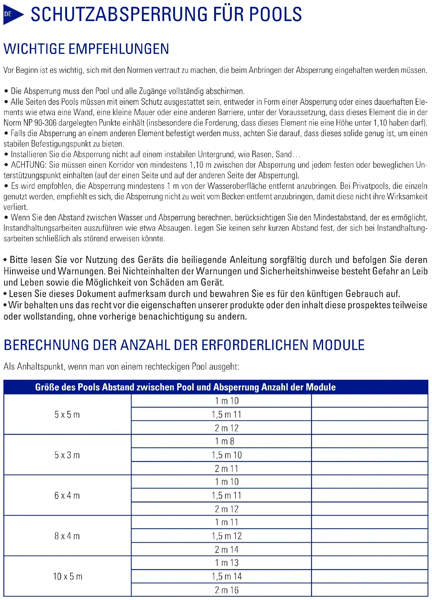 - Alle Seiten des Pools müssen mit einem Schutz ausgestattet sein, entweder in Form einer Absperrung oder eines dauerhaften Ele- ments wie etwa eine Wand, eine kleine Mauer oder eine anderen Barriere, unter der Voraussetzung, dass dieses Element die in der Norm NP 90-306 dargelegten Punkte einhält (insbesondere die Forderung, dass dieses Element nie eine Höhe unter 1,10 haben darf).