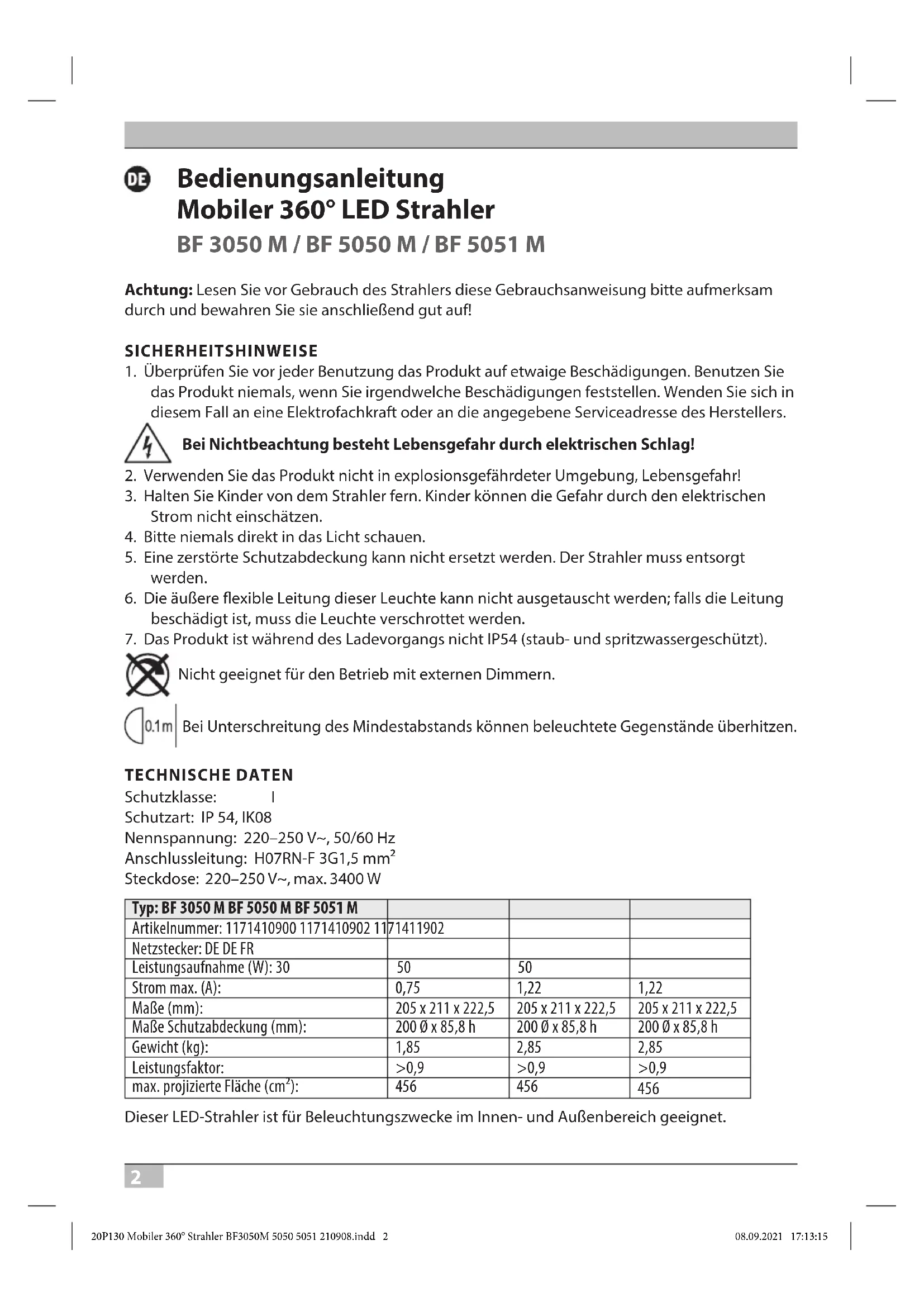 20P130 Mobiler 360° Strahler BF3050M 5050 5051 210908.indd 120P130 Mobiler 360° Strahler BF3050M 5050 5051 210908.indd 1 08.09.2021 17:13:1508.09.2021 17:13:152 Bedienungsanleitung Mobiler 360° LED Strahler BF 3050 M / BF 5050 M / BF 5051 M Achtung: Lesen Sie vor Gebrauch des Strahlers diese Gebrauchsanweisung bitte aufmerksam durch und bewahren Sie sie anschließend gut auf!SICHERHEITSHINWEISE1. Überprüfen Sie vor jeder Benutzung das Produkt auf etwaige Beschädigungen. Benutzen Sie das Produkt niemals, wenn Sie irgendwelche Beschädigungen feststellen. Wenden Sie sich in diesem Fall an eine Elektrofachkraft oder an die angegebene Serviceadresse des Herstellers. Bei Nichtbeachtung besteht Lebensgefahr durch elektrischen Schlag!2. Verwenden Sie das Produkt nicht in explosionsgefährdeter Umgebung, Lebensgefahr!3. Halten Sie Kinder von dem Strahler fern. Kinder können die Gefahr durch den elektrischen Strom nicht einschätzen.4. Bitte niemals direkt in das Licht schauen.5. Eine zerstörte Schutzabdeckung kann nicht ersetzt werden. Der Strahler muss entsorgt werden.6. Die äußere exible Leitung dieser Leuchte kann nicht ausgetauscht werden; falls die Leitung beschädigt ist, muss die Leuchte verschrottet werden.7. Das Produkt ist während des Ladevorgangs nicht IP54 (staub- und spritzwassergeschützt). Nicht geeignet für den Betrieb mit externen Dimmern. Bei Unterschreitung des Mindestabstands können beleuchtete Gegenstände überhitzen.TECHNISCHE DATENSchutzklasse: ISchutzart: IP 54, IK08 Nennspannung: 220–250 V~, 50/60 Hz Anschlussleitung: H07RN-F 3G1,5 mm² Steckdose: 220–250 V~, max. 3400 W Typ: BF 3050 M BF 5050 M BF 5051 M Artikelnummer: 1171410900 1171410902 1171411902 Netzstecker: DE DE FR Leistungsaufnahme (W): 30 50 50 Strom max. (A): 0,75 1,22 1,22 Maße (mm): 205 x 211 x 222,5 205 x 211 x 222,5 205 x 211 x 222,5 Maße Schutzabdeckung (mm): 200 Ø x 85,8 h 200 Ø x 85,8 h 200 Ø x 85,8 h Gewicht (kg): 1,85 2,85 2,85 Leistungsfaktor: >0,9 >0,9 >0,9 max. projizierte Fläche (cm²): 456 456