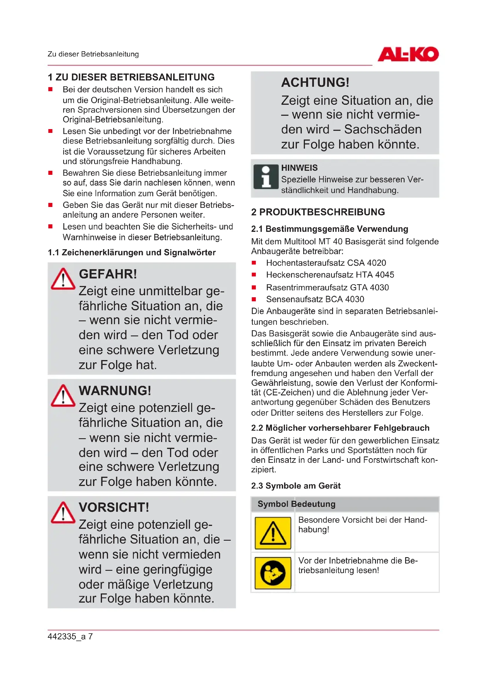 BEDIENUNGSANLEITUNG MT 40 AL-KO