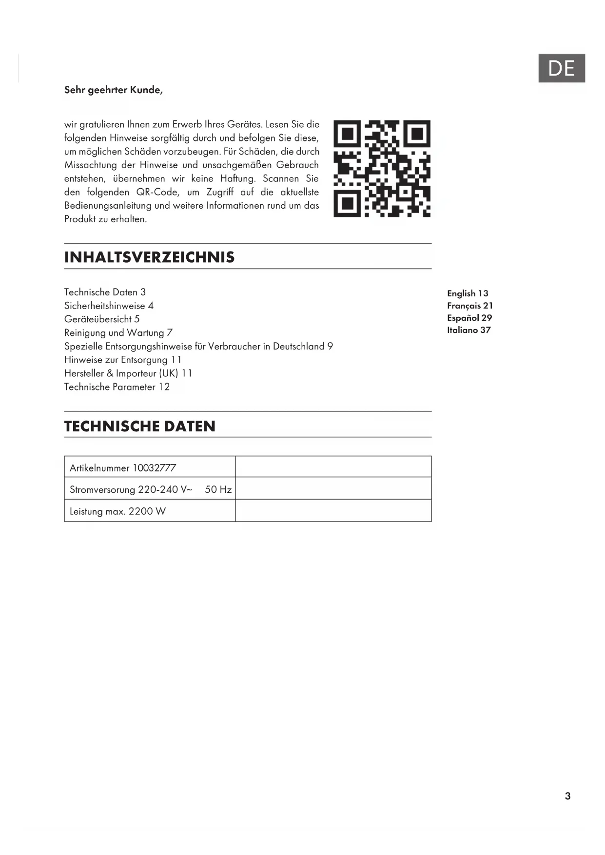 Sehr geehrter Kunde, wir gratulieren Ihnen zum Erwerb Ihres Gerätes. Lesen Sie die folgenden Hinweise sorgfältig durch und befolgen Sie diese, um möglichen Schäden vorzubeugen. Für Schäden, die durch Missachtung der Hinweise und unsachgemäßen Gebrauch entstehen, übernehmen wir keine Haftung. Scannen Sie den folgenden QR-Code, um Zugriff auf die aktuellste Bedienungsanleitung und weitere Informationen rund um das Produkt zu erhalten. INHALTSVERZEICHNIS Technische Daten 3 Sicherheitshinweise 4 Geräteübersicht 5 Reinigung und Wartung 7 Spezielle Entsorgungshinweise für Verbraucher in Deutschland 9 Hinweise zur Entsorgung 11 Hersteller & Importeur (UK) 11 Technische Parameter 12 TECHNISCHE DATEN Artikelnummer 10032777 Stromversorung 220-240 V~ 50 Hz Leistung max. 2200 W English 13 Français 21 Español 29 Italiano 374