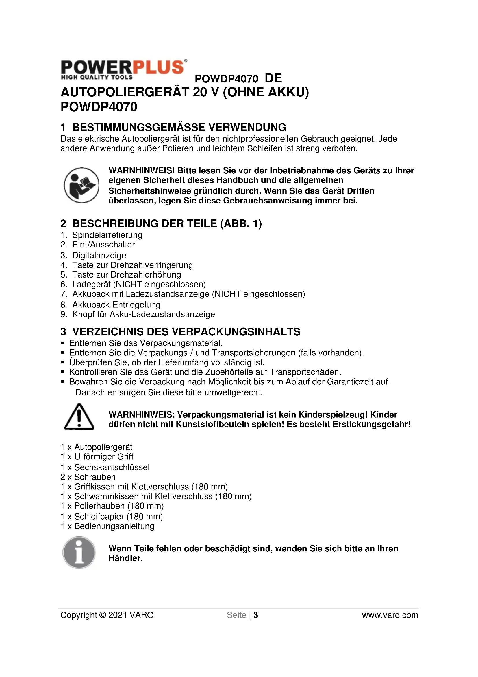 - Bewahren Sie die Verpackung nach Möglichkeit bis zum Ablauf der Garantiezeit auf. Danach entsorgen Sie diese bitte umweltgerecht. WARNHINWEIS: Verpackungsmaterial ist kein Kinderspielzeug! Kinder dürfen nicht mit Kunststoffbeuteln spielen! Es besteht Erstickungsgefahr! 1 x Autopoliergerät 1 x U-förmiger Griff 1 x Sechskantschlüssel 2 x Schrauben 1 x Griffkissen mit Klettverschluss (180 mm) 1 x Schwammkissen mit Klettverschluss (180 mm) 1 x Polierhauben (180 mm) 1 x Schleifpapier (180 mm) 1 x Bedienungsanleitung Wenn Teile fehlen oder beschädigt sind, wenden Sie sich bitte an Ihren Händler.POWDP4070 DE Copyright © 2021 VARO Seite | 4 www.varo.com