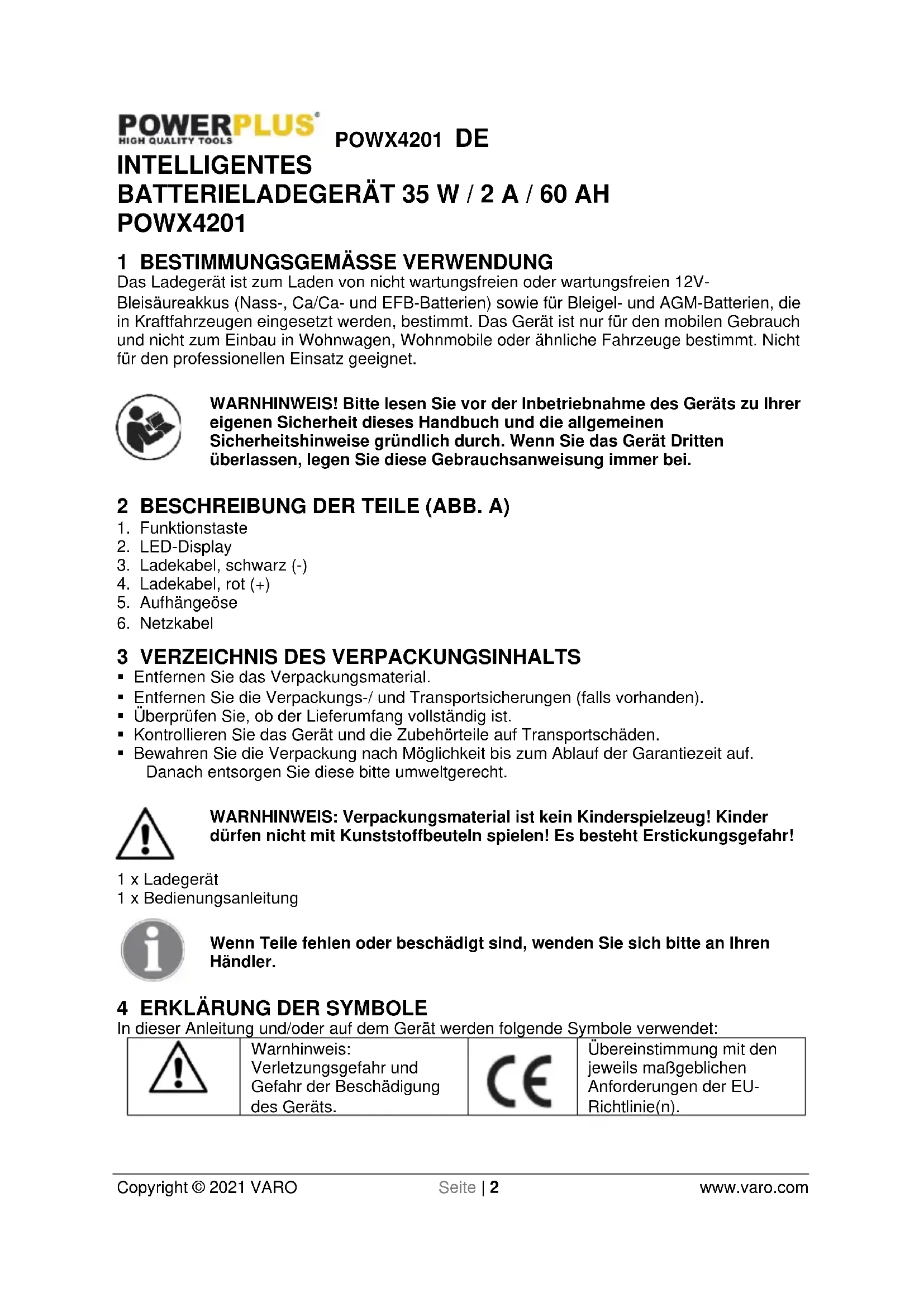 Hiermit erklären wir, VARO-Vic. Van Rompuy N.V., Joseph Van Instraat 9, B-2500 Lier, Belgien, dass das nachfolgend bezeichnete Gerät Bezeichnung des Geräts: Intelligentes Ladegerät Marke: POWERplus Modell-Nr.: POWX4201 den grundlegenden Anforderungen und anderen einschlägigen Bestimmungen der entsprechenden EU-Richtlinien auf der Grundlage der harmonisierten EU-Normen entspricht. Bei einer nicht mit uns abgestimmten Änderung des Geräts verliert diese Erklärung ihre Gültigkeit. EU-Richtlinien (einschließlich ihrer etwaigen Änderungen, bis zum Datum der Unterschrift): 2011/65/EU 2014/30/EU 2014/35/EU Harmonisierte EU-Normen (einschließlich ihrer etwaigen Änderungen, bis zum Datum der Unterschrift): EN60335-1 : 2012 EN60335-2-29 : 2004 EN55014-1 : 2017 EN55014-2 : 2015 EN61000-3-2 : 2014 EN61000-3-3 : 2013 Halter der Technischen Dokumentation: Philippe Vankerkhove, VARO – Vic. Van Rompuy N.V. Der Unterzeichner handelt im Namen der Geschäftsführung des Unternehmens, Philippe Vankerkhove Zulassungsabteilung – Compliance Manager Lier, 27/11/2020POWX4201 ES Copyright © 2021 VARO P á g i n a | 1 www.varo.com 1 USO PREVISTO .............................................................................. 2