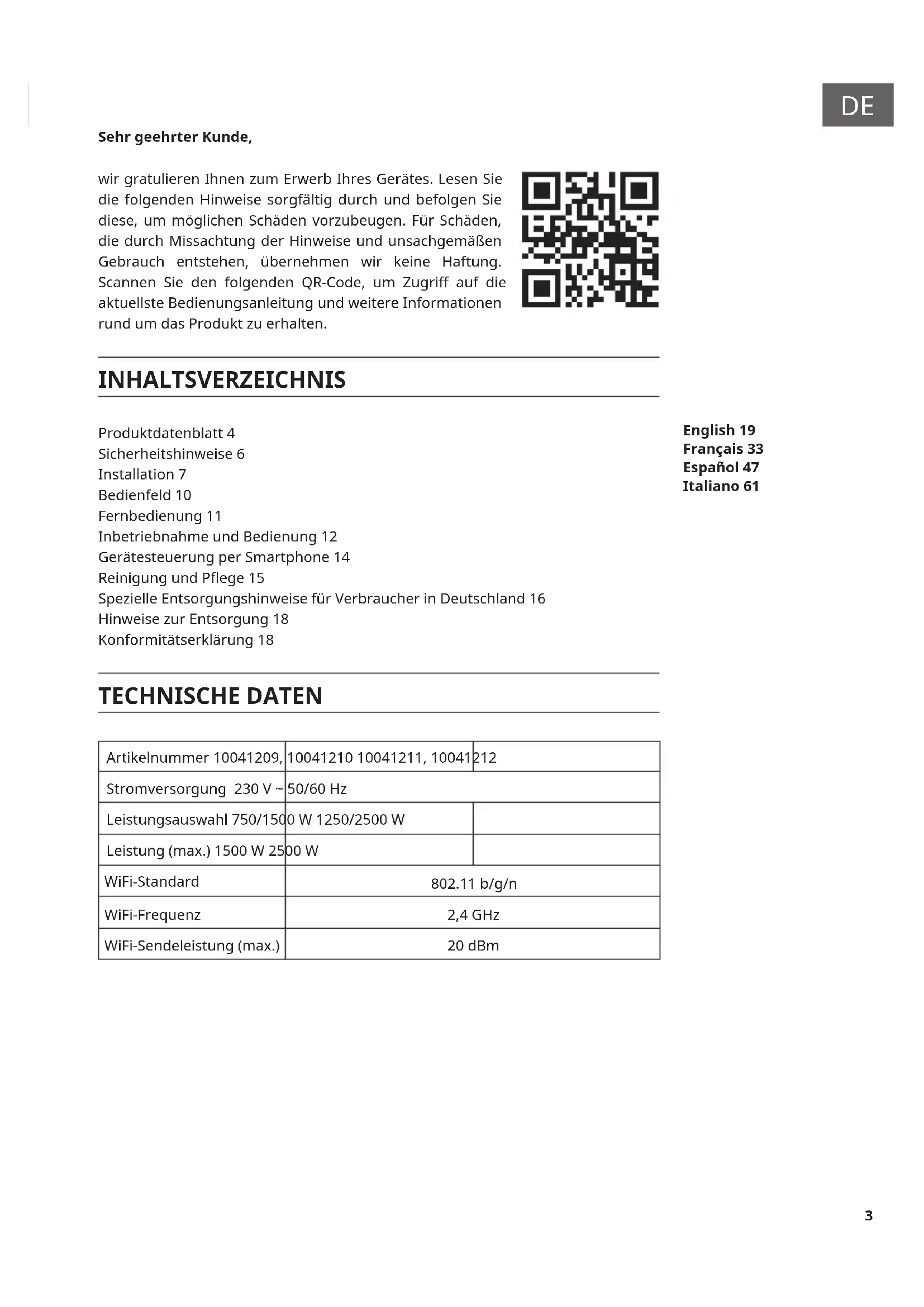 Sehr geehrter Kunde, wir gratulieren Ihnen zum Erwerb Ihres Gerätes. Lesen Sie die folgenden Hinweise sorgfältig durch und befolgen Sie diese, um möglichen Schäden vorzubeugen. Für Schäden, die durch Missachtung der Hinweise und unsachgemäßen Gebrauch entstehen, übernehmen wir keine Haftung. Scannen Sie den folgenden QR-Code, um Zugri auf die aktuellste Bedienungsanleitung und weitere Informationen rund um das Produkt zu erhalten. INHALTSVERZEICHNIS Produktdatenblatt 4 Sicherheitshinweise 6 Installation 7 Bedienfeld 10 Fernbedienung 11 Inbetriebnahme und Bedienung 12 Gerätesteuerung per Smartphone 14 Reinigung und Pege 15 Spezielle Entsorgungshinweise für Verbraucher in Deutschland 16 Hinweise zur Entsorgung 18 Konformitätserklärung 18 TECHNISCHE DATEN Artikelnummer 10041209, 10041210 10041211, 10041212 Stromversorgung 230 V ~ 50/60 Hz Leistungsauswahl 750/1500 W 1250/2500 W Leistung (max.) 1500 W 2500 W WiFi-Standard