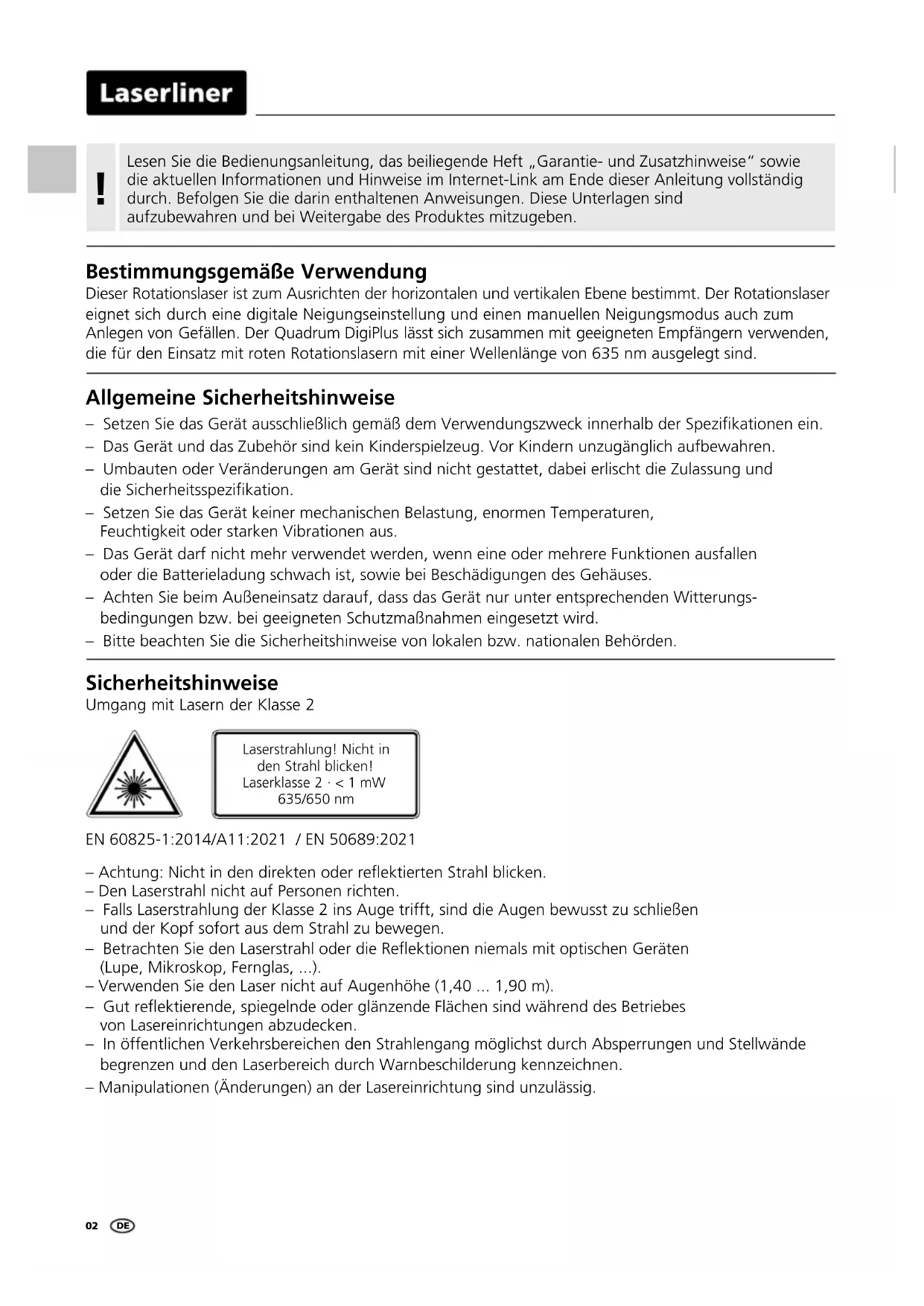 Bestimmungsgemäße Verwendung Dieser Rotationslaser ist zum Ausrichten der horizontalen und vertikalen Ebene bestimmt. Der Rotationslaser eignet sich durch eine digitale Neigungseinstellung und einen manuellen Neigungsmodus auch zum Anlegen von Gefällen. Der Quadrum DigiPlus lässt sich zusammen mit geeigneten Empfängern verwenden, die für den Einsatz mit roten Rotationslasern mit einer Wellenlänge von 635 nm ausgelegt sind. Sicherheitshinweise Umgang mit Lasern der Klasse 2 Laserstrahlung! Nicht in den Strahl blicken! Laserklasse 2 · < 1 mW 635/650 nm – Achtung: Nicht in den direkten oder reektierten Strahl blicken. – Den Laserstrahl nicht auf Personen richten. – Falls Laserstrahlung der Klasse 2 ins Auge trifft, sind die Augen bewusst zu schließen und der Kopf sofort aus dem Strahl zu bewegen. – Betrachten Sie den Laserstrahl oder die Reektionen niemals mit optischen Geräten (Lupe, Mikroskop, Fernglas, ...). – Verwenden Sie den Laser nicht auf Augenhöhe (1,40 ... 1,90 m). – Gut reektierende, spiegelnde oder glänzende Flächen sind während des Betriebes von Lasereinrichtungen abzudecken. – In öffentlichen Verkehrsbereichen den Strahlengang möglichst durch Absperrungen und Stellwände begrenzen und den Laserbereich durch Warnbeschilderung kennzeichnen. – Manipulationen (Änderungen) an der Lasereinrichtung sind unzulässig. EN 60825-1:2014/A11:2021 / EN 50689:2021Quadrum DigiPlus IP 66 Besondere Produkteigenschaften und Funktionen Schutz vor Staub und Wasser – Das Gerät zeichnet sich durch besonderen Schutz vor Staub und Regen aus. Transport LOCK: Das Gerät wird mit einer speziellen Motorbremse beim Transport geschützt. Der Rotationslaser richtet sich selbständig aus. Er wird in die benötigte Grundstellung aufgestellt – innerhalb des Arbeitswinkels von ± 6°. Die Feineinstellung übernimmt sofort die Automatik: Drei elektronische Messsensoren erfassen dabei die X-, Y- und Z-Achse.