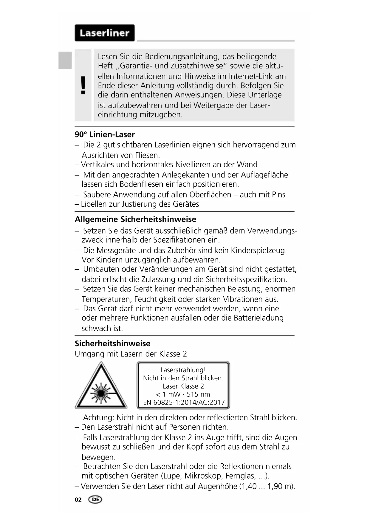 Sicherheitshinweise Umgang mit Lasern der Klasse 2 Laserstrahlung! Nicht in den Strahl blicken! Laser Klasse 2 < 1 mW · 515 nm EN 60825-1:2014/AC:2017 – Achtung: Nicht in den direkten oder reektierten Strahl blicken. – Den Laserstrahl nicht auf Personen richten. – Falls Laserstrahlung der Klasse 2 ins Auge trifft, sind die Augen bewusst zu schließen und der Kopf sofort aus dem Strahl zu bewegen. – Betrachten Sie den Laserstrahl oder die Reektionen niemals mit optischen Geräten (Lupe, Mikroskop, Fernglas, ...). – Verwenden Sie den Laser nicht auf Augenhöhe (1,40 ... 1,90 m). Allgemeine Sicherheitshinweise – Setzen Sie das Gerät ausschließlich gemäß dem Verwendungs- zweck innerhalb der Spezikationen ein. – Die Messgeräte und das Zubehör sind kein Kinderspielzeug. Vor Kindern unzugänglich aufbewahren. – Umbauten oder Veränderungen am Gerät sind nicht gestattet, dabei erlischt die Zulassung und die Sicherheitsspezikation. – Setzen Sie das Gerät keiner mechanischen Belastung, enormen Temperaturen, Feuchtigkeit oder starken Vibrationen aus. – Das Gerät darf nicht mehr verwendet werden, wenn eine oder mehrere Funktionen ausfallen oder die Batterieladung schwach ist. 90° Linien-Laser – Die 2 gut sichtbaren Laserlinien eignen sich hervorragend zum Ausrichten von Fliesen. – Vertikales und horizontales Nivellieren an der Wand – Mit den angebrachten Anlegekanten und der Auageäche lassen sich Bodeniesen einfach positionieren. – Saubere Anwendung auf allen Oberächen – auch mit Pins – Libellen zur Justierung des GerätesSuperSquare-Laser 2G