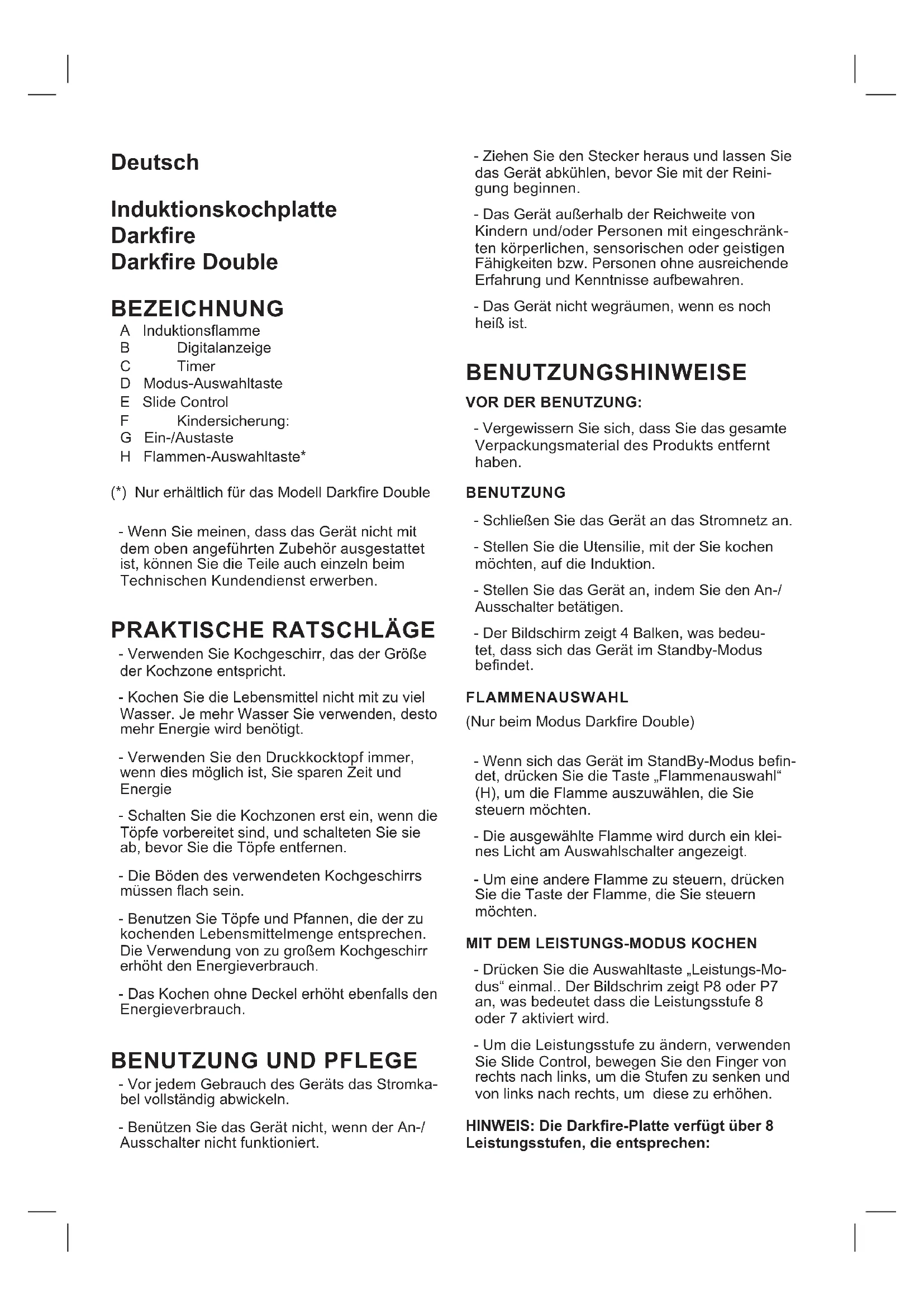 - Stellen Sie das Gerät mit dem An-/Ausschalter ab. - Den Stecker aus der Netzdose ziehen. - Das Gerät säubern WÄRMESCHUTZSCHALTER Das Gerät ist mit einem Wärmeschutzschalter ausgestattet, wodurch es gegen Überhitzung geschützt ist. - Schaltet sich das Gerät von selbst aus und nicht wieder ein, unterbrechen Sie die Strom- zufuhr, warten Sie 15 Minuten und schalten es wieder ein. FEHLERCODES Der Bildschirm kann verschiedene Fehlercodes anzeigen. E0 → Es wird keine Utensilie auf der Platte erkannt E1 → Die Platte wird nicht mit genügend Span- nung versorgt. E2 → Die Spannung im Inneren ist zu hoch. E3 → Oener Thermostat E4 → Thermostat defekt oder abgeschaltet. E5 → Thermostat der Basisplatte oen E6 → Termostato de Basisplatte defekt oder abgeschaltet E7 → Inneres Temperaturerkennungssystem oen. E8 → Unbestimmer interner Fehler. E9 → Überhitzung. Beim Fehler E0 überprüfen, ob die verwendete Küchenutensilie für Induktion geeignet ist.Bei den Fehlen E1 – E9, ldas Gerät zum nächst- gelegenen technischen Servicecenter bringen. REINIGUNG - Ziehen Sie den Stecker heraus und lassen Sie das Gerät abkühlen, bevor Sie mit der Reini- gung beginnen. - Reinigen Sie das Gerät mit einem feuchten Tuch, auf das Sie einige Tropfen Reinigungs- mittel geben und trocknen Sie es danach ab. - Verwenden Sie zur Reinigung des Geräts we- der Löse- oder Scheuermittel, noch Produkte mit einem sauren oder basischen pH-Wert wie z.B. Lauge. - Das Gerät nicht in Wasser oder andere Flüs- sigkeiten tauchen und nicht unter den Wasser- hahn halten. - Es wird empfohlen, Speisereste regelmäßig vom Gerät zu entfernen. - Halten Sie das Gerät nicht sauber, so könnten sich der Zustand seiner Oberäche verschlech- tern, seine Lebenszeit negativ beeinusst und gefährliche Situationen verursacht werden. BESONDERE MELDUNGENItaliano Piastra a induzione Darkre Darkre Double DESCRIZIONE A Fornello a induzione B Display digitale C Timer D Selettore modalità E Slide control F Blocco per bambini G Interruttore accensione/spegnimento H Selettore di fornello* (*) Disponibile solo nel modello Darkre Double - Se il modello del Suo apparecchio non fosse dotato degli accessori anteriormente elencati, può acquistarli separatamente presso i punti di assistenza tecnica autorizzati. CONSIGLI PRATICI - Utilizzare l’utensile di cottura adeguato alle dimensioni del fornello. - Non cucinare gli alimenti con eccessiva acqua. Quanta più acqua si usi, più energia sarà necessaria. - Utilizzando la pentola a pressione si risparmia- no tempo ed energia elettrica. - Accendere i fornelli di cottura solamente quan- do i recipienti siano pronti e spegnerli prima di rimuovere tali recipienti. - Gli utensili di cottura devono essere piani. - Utilizzare recipienti di cottura adeguati alle quantità da cucinare. Utilizzare recipienti grandi per piccole quantità aumenta il consumo di energia. - Cucinare senza usare il coperchio del recipien- te di cottura aumenta il consumo di energia.