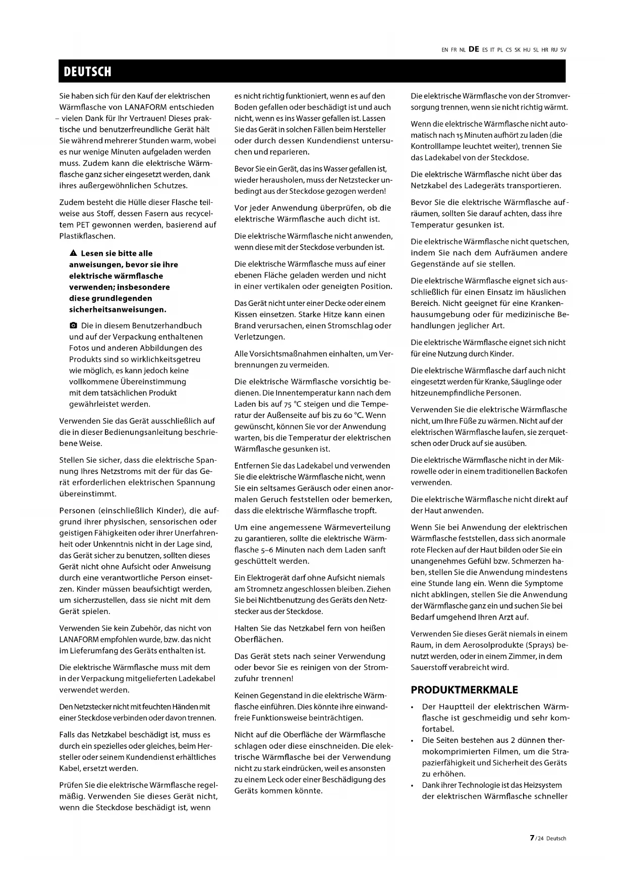 Die in diesem Benutzerhandbuch und auf der Verpackung enthaltenen Fotos und anderen Abbildungen des Produkts sind so wirklichkeitsgetreu wie möglich, es kann jedoch keine vollkommene Übereinstimmung mit dem tatsächlichen Produkt gewährleistet werden. Verwenden Sie das Gerät ausschließlich auf die in dieser Bedienungsanleitung beschrie- bene Weise. Stellen Sie sicher, dass die elektrische Span- nung Ihres Netzstroms mit der für das Ge- rät erforderlichen elektrischen Spannung übereinstimmt. Personen (einschließlich Kinder), die auf- grund ihrer physischen, sensorischen oder geistigen Fähigkeiten oder ihrer Unerfahren- heit oder Unkenntnis nicht in der Lage sind, das Gerät sicher zu benutzen, sollten dieses Gerät nicht ohne Aufsicht oder Anweisung durch eine verantwortliche Person einset- zen. Kinder müssen beaufsichtigt werden, um sicherzustellen, dass sie nicht mit dem Gerät spielen. Verwenden Sie kein Zubehör, das nicht von LANAFORM empfohlen wurde, bzw. das nicht im Lieferumfang des Geräts enthalten ist. Die elektrische Wärmasche muss mit dem in der Verpackung mitgelieferten Ladekabel verwendet werden. Den Netzstecker nicht mit feuchten Händen mit einer Steckdose verbinden oder davon trennen. Falls das Netzkabel beschädigt ist, muss es durch ein spezielles oder gleiches, beim Her- steller oder seinem Kundendienst erhältliches Kabel, ersetzt werden. Prüfen Sie die elektrische Wärmasche regel- mäßig. Verwenden Sie dieses Gerät nicht, wenn die Steckdose beschädigt ist, wenn es nicht richtig funktioniert, wenn es auf den Boden gefallen oder beschädigt ist und auch nicht, wenn es ins Wasser gefallen ist. Lassen Sie das Gerät in solchen Fällen beim Hersteller oder durch dessen Kundendienst untersu- chen und reparieren. Bevor Sie ein Gerät, das ins Wasser gefallen ist, wieder herausholen, muss der Netzstecker un- bedingt aus der Steckdose gezogen werden! Vor jeder Anwendung überprüfen, ob die elektrische Wärmasche auch dicht ist. Die elektrische Wärmasche nicht anwenden, wenn diese mit der Steckdose verbunden ist. Die elektrische Wärmasche muss auf einer ebenen Fläche geladen werden und nicht in einer vertikalen oder geneigten Position. Das Gerät nicht unter einer Decke oder einem Kissen einsetzen. Starke Hitze kann einen Brand verursachen, einen Stromschlag oder Verletzungen. Alle Vorsichtsmaßnahmen einhalten, um Ver- brennungen zu vermeiden. Die elektrische Wärmasche vorsichtig be- dienen. Die Innentemperatur kann nach dem Laden bis auf 75 °C steigen und die Tempe- ratur der Außenseite auf bis zu 60 °C. Wenn gewünscht, können Sie vor der Anwendung warten, bis die Temperatur der elektrischen Wärmasche gesunken ist. Entfernen Sie das Ladekabel und verwenden Sie die elektrische Wärmasche nicht, wenn Sie ein seltsames Geräusch oder einen anor- malen Geruch feststellen oder bemerken, dass die elektrische Wärmasche tropft. Um eine angemessene Wärmeverteilung zu garantieren, sollte die elektrische Wärm- asche 5–6 Minuten nach dem Laden sanft geschüttelt werden. Ein Elektrogerät darf ohne Aufsicht niemals am Stromnetz angeschlossen bleiben. Ziehen Sie bei Nichtbenutzung des Geräts den Netz- stecker aus der Steckdose. Halten Sie das Netzkabel fern von heißen Oberächen. Das Gerät stets nach seiner Verwendung oder bevor Sie es reinigen von der Strom- zufuhr trennen! Keinen Gegenstand in die elektrische Wärm- asche einführen. Dies könnte ihre einwand- freie Funktionsweise beinträchtigen. Nicht auf die Oberäche der Wärmasche schlagen oder diese einschneiden. Die elek- trische Wärmasche bei der Verwendung nicht zu stark eindrücken, weil es ansonsten zu einem Leck oder einer Beschädigung des Geräts kommen könnte. Die elektrische Wärmasche von der Stromver- sorgung trennen, wenn sie nicht richtig wärmt. Wenn die elektrische Wärmasche nicht auto- matisch nach 15 Minuten aufhört zu laden (die Kontrolllampe leuchtet weiter), trennen Sie das Ladekabel von der Steckdose. Die elektrische Wärmasche nicht über das Netzkabel des Ladegeräts transportieren. Bevor Sie die elektrische Wärmasche auf