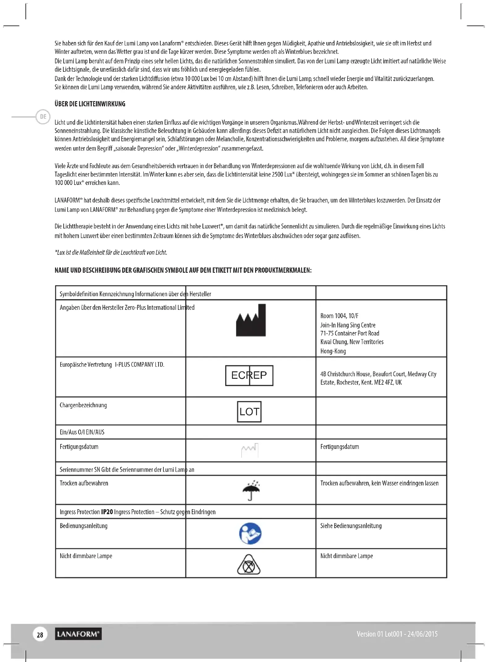 Licht und die Lichtintensität haben einen starken Einuss auf die wichtigen Vorgänge in unserem Organismus.Während der Herbst- und Winterzeit verringert sich die Sonneneinstrahlung. Die klassische künstliche Beleuchtung in Gebäuden kann allerdings dieses Dezit an natürlichem Licht nicht ausgleichen. Die Folgen dieses Lichtmangels können Antriebslosigkeit und Energiemangel sein, Schlafstörungen oder Melancholie, Konzentrationsschwierigkeiten und Probleme, morgens aufzustehen. All diese Symptome werden unter dem Begri „saisonale Depression“ oder „Winterdepression“ zusammengefasst. Viele Ärzte und Fachleute aus dem Gesundheitsbereich vertrauen in der Behandlung von Winterdepressionen auf die wohltuende Wirkung von Licht, d.h. in diesem Fall Tageslicht einer bestimmten Intensität. Im Winter kann es aber sein, dass die Lichtintensität keine 2500 Lux* übersteigt, wohingegen sie im Sommer an schönen Tagen bis zu 100 000 Lux* erreichen kann. LANAFORM® hat deshalb dieses spezische Leuchtmittel entwickelt, mit dem Sie die Lichtmenge erhalten, die Sie brauchen, um den Winterblues loszuwerden. Der Einsatz der Lumi Lamp von LANAFORM® zur Behandlung gegen die Symptome einer Winterdepression ist medizinisch belegt. Die Lichttherapie besteht in der Anwendung eines Lichts mit hohe Luxwert*, um damit das natürliche Sonnenlicht zu simulieren. Durch die regelmäßige Einwirkung eines Lichts mit hohem Luxwert über einen bestimmten Zeitraum können sich die Symptome des Winterblues abschwächen oder sogar ganz auösen. *Lux ist die Maßeinheit für die Leuchtkraft von Licht. NAME UND BESCHREIBUNG DER GRAFISCHEN SYMBOLE AUF DEM ETIKETT MIT DEN PRODUKTMERKMALEN: Symboldenition Kennzeichnung Informationen über den Hersteller Angaben über den Hersteller Zero-Plus International Limited Room 1004, 10/F Join-In Hang Sing Centre 71-75 Container Port Road Kwai Chung, New Territories Hong-Kong Europäische Vertretung I-PLUS COMPANY LTD. 4B Christchurch House, Beaufort Court, Medway City Estate, Rochester, Kent. ME2 4FZ, UK Chargenbezeichnung Ein/Aus O/I EIN/AUS Fertigungsdatum Fertigungsdatum Seriennummer SN Gibt die Seriennummer der Lumi Lamp an Trocken aufbewahren Trocken aufbewahren, kein Wasser eindringen lassen Ingress Protection IP20 Ingress Protection – Schutz gegen Eindringen Bedienungsanleitung Siehe Bedienungsanleitung Nicht dimmbare Lampe Nicht dimmbare Lampe LOT EC REP DE29 Version 01 Lot001 - 24/06/2015 Achtung, Gebrauchsanleitung beachten! Achtung, lesen Sie die mitgelieferten Dokumente durch. Lesen Sie vor Verwendung dieses Geräts bitte diese Bedienungsanleitung. Halten Sie sich bei Verwendung des Geräts genauestens an diese Bedienungsanweisungen. Gebrauchsanleitung beachten Bitte die Gebrauchsanleitung zum Produkt durchlesen Schutzklasse II Richtlinie über Elektro- und Elektronik-Altgeräte (WEEE-Richtlinie) CE-Symbol Das CE-Symbol zertiziert dass das Produkt die grundlegenden Anforderungen für Medizinprodukte von Richtlinie 93/42/EWG erfüllt LESEN SIE BITTE ALLE ANWEISUNGEN, BEVOR SIE IHR „DAY LIGHT“ VERWENDEN, INSBESONDERE DIESE GRUNDLEGENDEN SICHERHEITSANWEISUNGEN: