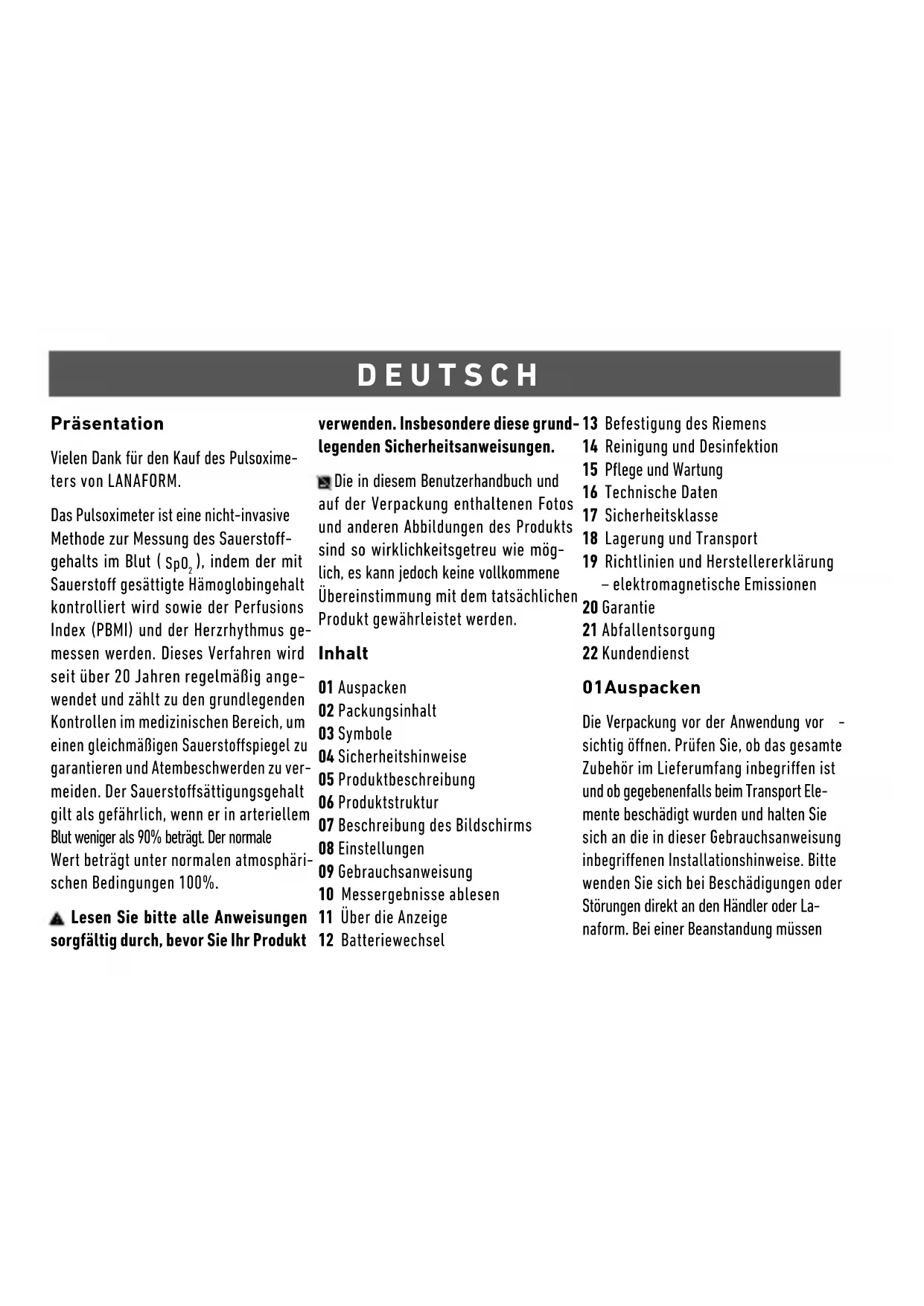 ), indem der mit Sauersto gesättigte Hämoglobingehalt kontrolliert wird sowie der Perfusions Index (PBMI) und der Herzrhythmus ge- messen werden. Dieses Verfahren wird seit über 20 Jahren regelmäßig ange- wendet und zählt zu den grundlegenden Kontrollen im medizinischen Bereich, um einen gleichmäßigen Sauerstospiegel zu garantieren und Atembeschwerden zu ver- meiden. Der Sauerstosättigungsgehalt gilt als gefährlich, wenn er in arteriellem Blut weniger als 90% beträgt. Der normale Wert beträgt unter normalen atmosphäri- schen Bedingungen 100%. Lesen Sie bitte alle Anweisungen sorgfältig durch, bevor Sie Ihr Produkt verwenden. Insbesondere diese grund- legenden Sicherheitsanweisungen. Die in diesem Benutzerhandbuch und auf der Verpackung enthaltenen Fotos und anderen Abbildungen des Produkts sind so wirklichkeitsgetreu wie mög- lich, es kann jedoch keine vollkommene Übereinstimmung mit dem tatsächlichen Produkt gewährleistet werden. Inhalt 01 Auspacken 02 Packungsinhalt 03 Symbole 04 Sicherheitshinweise 05 Produktbeschreibung 06 Produktstruktur 07 Beschreibung des Bildschirms 08 Einstellungen 09 Gebrauchsanweisung 10 Messergebnisse ablesen 11 Über die Anzeige 12 Batteriewechsel 13 Befestigung des Riemens 14 Reinigung und Desinfektion 15 Pege und Wartung 16 Technische Daten 17 Sicherheitsklasse 18 Lagerung und Transport 19 Richtlinien und Herstellererklärung – elektromagnetische Emissionen 20 Garantie 21 Abfallentsorgung 22 Kundendienst 01 Auspacken Die Verpackung vor der Anwendung vor