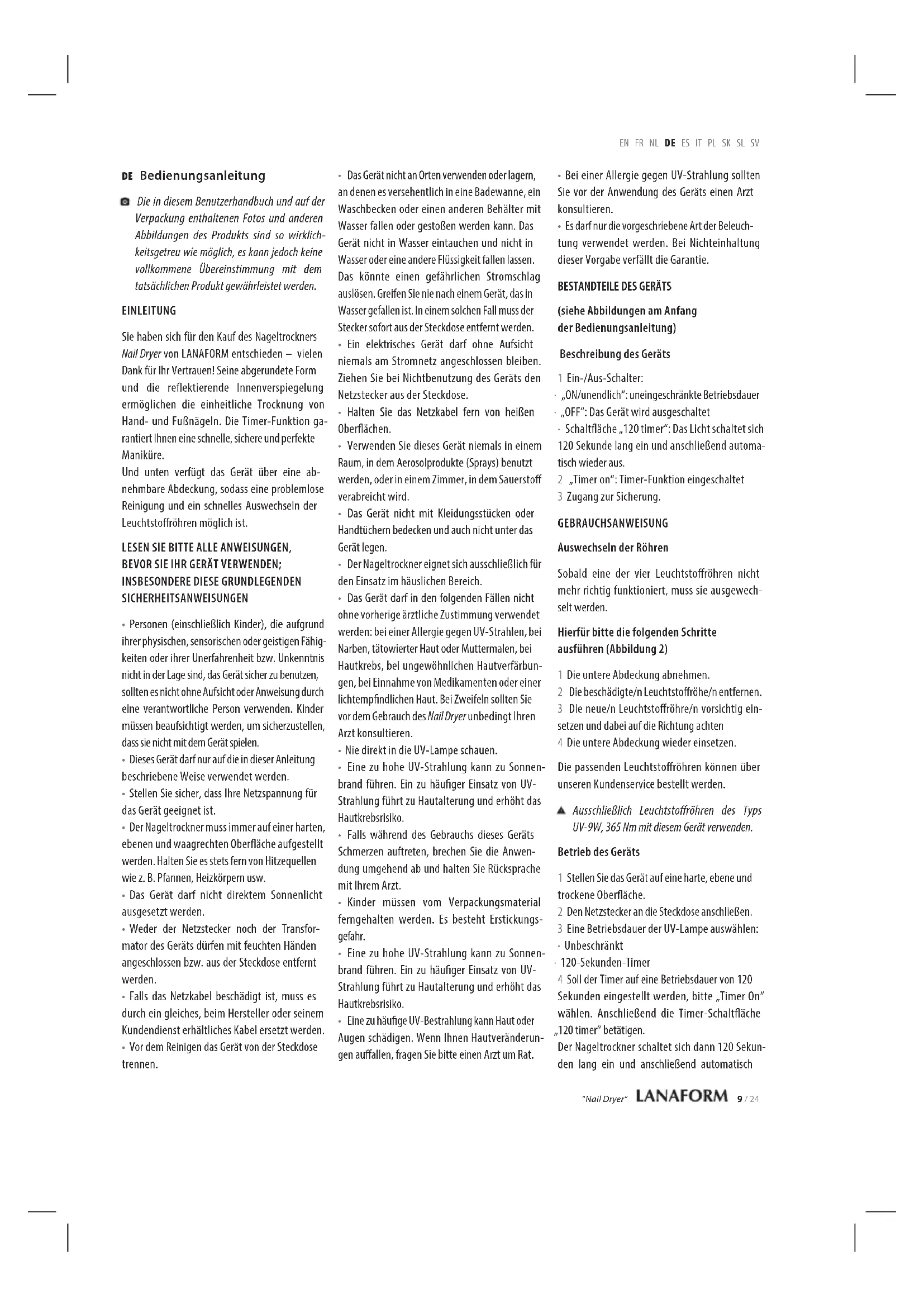 LANAFORM garantiert die Freiheit von Material- und Fabrikationsfehlern des Geräts, und zwar für eine Dauer von zwei Jahren ab Kaufdatum. Dabei gelten folgende Ausnahmen : Die LANAFORM Garantie deckt keine Beschädigungen aufgrund von normaler Abnutzung dieses Gerätes ab. Darüber hinaus erstreckt sich die Garantie auf das LANAFORM-Gerät nicht auf Schäden, die auf unsach- gemäßen oder übermäßigen Gebrauch, Unfälle, die Verwendung nicht vom Hersteller empfohlener Zu- behörteile, Umbauten am Gerät oder auf sonstige Umstände gleich welcher Art zurückzuführen sind, die sich dem Wissen und dem Einuss von LANA- FORM entziehen. LANAFORM haftet nicht für Begleit-, Folge- und besondere Schäden. Alle impliziten Garantien in Bezug auf die Eignung des Gerätes sind auf eine Frist von zwei Jahren ab dem anfänglichen Kaufdatum beschränkt, soweit eine Kopie des Kaufnachweis vorgelegt werden kann. Auf Garantie eingeschickte Geräte werden von LANA- FORM nach eigenem Ermessen entweder repariert oder ausgetauscht und an Sie zurückgesendet. Die Garantie gilt nur bei Reparatur im LANAFORM Kundendienstzentrum. Bei Reparatur durch einen anderen Kunden- dienstanbieter erlischt die Garantie. ES Manual de instrucciones Las fotografías y demás representaciones del producto que guran en el presente manual y en el embalaje pretenden ser lo más precisas posibles, pero no necesariamente exactas al producto real. INTRODUCCIÓN Gracias por comprar el secador de uñas Nail Dryer de LANAFORM. Su forma redondeada y su interior reectante permiten secar de manera uniforme las uñas de manos y pies. Su función «tempori- zador» le garantizará una manicura rápida, segura y perfecta. Está equipado con una base extraíble para facilitar la limpieza y la rápida sustitución de los tubos uorescentes.