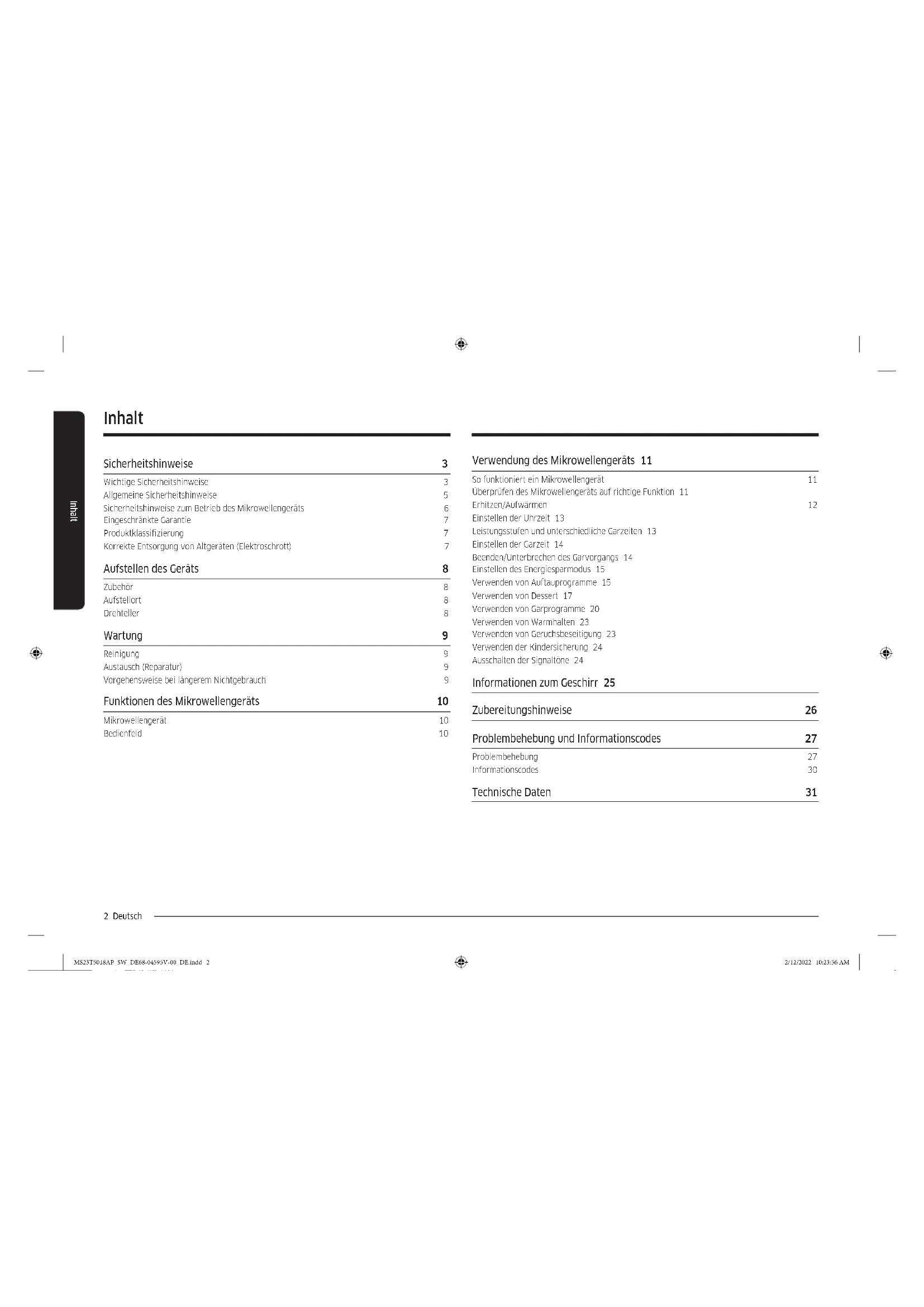 - (opłata według taryfy operatora) http://www.samsung.com/pl/ support/ LITHUANIA 8-800-77777 www.samsung.com/lt/support LATVIA 8000-7267 www.samsung.com/lv/support ESTONIA 800-7267 www.samsung.com/ee/support MS23T5018AP_SW_DE68-04595V-00_EN.indd 32MS23T5018AP_SW_DE68-04595V-00_EN.indd 32 2/12/2022 9:58:50 AM2/12/2022 9:58:50 AMMikrowellengerät Benutzerhandbuch MS23T5018A* MS23T5018AP_SW_DE68-04595V-00_DE.indd 1MS23T5018AP_SW_DE68-04595V-00_DE.indd 1 2/12/2022 10:23:56 AM2/12/2022 10:23:56 AM2 Deutsch Inhalt Verwendung des Mikrowellengeräts 11 So funktioniert ein Mikrowellengerät 11 Überprüfen des Mikrowellengeräts auf richtige Funktion 11 Erhitzen/Aufwärmen 12 Einstellen der Uhrzeit 13 Leistungsstufen und unterschiedliche Garzeiten 13 Einstellen der Garzeit 14 Beenden/Unterbrechen des Garvorgangs 14 Einstellen des Energiesparmodus 15 Verwenden von Auftauprogramme 15 Verwenden von Dessert 17 Verwenden von Garprogramme 20 Verwenden von Warmhalten 23 Verwenden von Geruchsbeseitigung 23 Verwenden der Kindersicherung 24 Ausschalten der Signaltöne 24 Informationen zum Geschirr 25 Zubereitungshinweise 26 Problembehebung und Informationscodes 27 Problembehebung 27 Informationscodes 30 Technische Daten 31 Inhalt Sicherheitshinweise 3 Wichtige Sicherheitshinweise 3 Allgemeine Sicherheitshinweise 5 Sicherheitshinweise zum Betrieb des Mikrowellengeräts 6 Eingeschränkte Garantie 7 Produktklassizierung 7 Korrekte Entsorgung von Altgeräten (Elektroschrott) 7 Aufstellen des Geräts 8 Zubehör 8 Aufstellort 8 Drehteller 8 Wartung 9 Reinigung 9 Austausch (Reparatur) 9 Vorgehensweise bei längerem Nichtgebrauch 9 Funktionen des Mikrowellengeräts 10 Mikrowellengerät 10 Bedienfeld 10 MS23T5018AP_SW_DE68-04595V-00_DE.indd 2MS23T5018AP_SW_DE68-04595V-00_DE.indd 2 2/12/2022 10:23:56 AM2/12/2022 10:23:56 AMDeutsch 3 Sicherheitshinweise Sicherheitshinweise WICHTIGE SICHERHEITSHINWEISE LESEN SIE DIE FOLGENDEN HINWEISE AUFMERKSAM DURCH, UND BEWAHREN SIE SIE SO AUF, DASS SIE SIE SPÄTER SCHNELL WIEDERFINDEN. WARNUNG: Wenn die Gerätetür oder die Türscharniere beschädigt sind, darf das Gerät bis zur Reparatur durch sachkundiges Fachpersonal nicht verwendet werden. WARNUNG: Wartungs- oder Reparaturarbeiten, für die der Schutz gegen Mikrowellenstrahlung entfernt werden muss, dürfen nur von sachkundigem Fachpersonal ausgeführt werden. WARNUNG: Flüssigkeiten und feste Lebensmittel dürfen nicht in luftdicht verschlossenen Behältnissen erhitzt werden, da diese explodieren können. WARNUNG: Kinder dürfen das Gerät nur dann ohne Aufsicht verwenden, wenn sie die Risiken eines unsachgemäßen Gebrauchs kennen und genaue Anweisungen zum sicheren Umgang mit dem Gerät erhalten haben. Dieses Gerät ist ausschließlich für den Gebrauch im Haushalt bestimmt und nicht für die Verwendung: