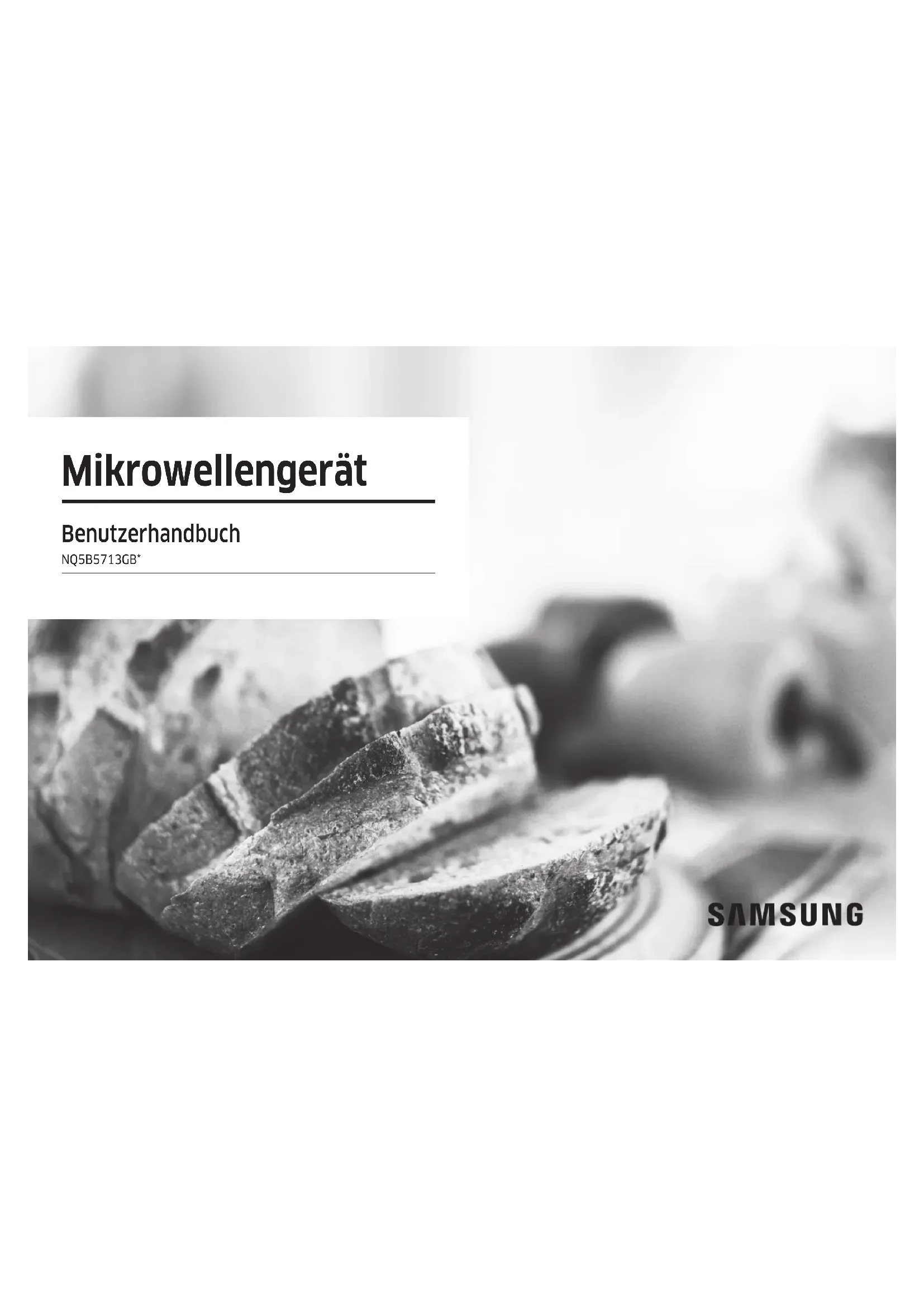 Chamada para a rede xa nacional Dias úteis das 9h às 20h www.samsung.com/pt/support SPAIN 91 175 00 15 www.samsung.com/es/support SWEDEN 0771-400 300 www.samsung.com/se/support SWITZERLAND 0800 726 786 www.samsung.com/ch/support (German) www.samsung.com/ch_fr/support (French) UK 0333 000 0333 www.samsung.com/uk/support IRELAND (EIRE) 0818 717100 www.samsung.com/ie/support DG68-01403A-03Mikrowellengerät Benutzerhandbuch NQ5B5713GB*2 Deutsch Inhalt Inhalt Sicherheitshinweise 3 Wichtige Sicherheitshinweise 3 Allgemeine Sicherheitshinweise 5 Sicherheitshinweise zum Betrieb des Mikrowellengeräts 6 Eingeschränkte Garantie 6 Produktklassizierung 7 Korrekte Entsorgung von Altgeräten 7 Aufstellen des Geräts 8 Lieferumfang 8 Einbauanleitung 8 Wartung 11 Reinigung 11 Austausch (Reparatur) 12 Vorgehensweise bei längerem Nichtgebrauch 12 Vor der ersten Verwendung 12 Bedienfeld 12 Uhrzeit 13 Informationen zur Mikrowellen-Energie 13 Mikrowellengeeignetes Geschirr 14 Bedienung 15 Funktionsübersicht 15 Mikrowellenmodus 16 Automatikbetrieb 17 Sonderfunktionen 20 Weitere Funktionen 22 Systemeinstellungen 23 Einfache Einrichtung 23 Intelligentes Garen 23 Manuelles Garen 23 Praktische Tipps 29 Problembehebung 29 Prüfstellen 29 Informationscodes 34 Technische Daten 34 Anhang 35 Open Source-Erklärung 35Deutsch 3 Sicherheitshinweise Sicherheitshinweise WICHTIGE SICHERHEITSHINWEISE LESEN SIE DIE FOLGENDEN HINWEISE AUFMERKSAM DURCH, UND BEWAHREN SIE SIE SO AUF, DASS SIE SIE SPÄTER SCHNELL WIEDERFINDEN. WARNUNG: Wenn die Gerätetür oder die Türscharniere beschädigt sind, darf das Gerät bis zur Reparatur durch sachkundiges Fachpersonal nicht verwendet werden. WARNUNG: Wartungs- oder Reparaturarbeiten, für die der Schutz gegen Mikrowellenstrahlung entfernt werden muss, dürfen nur von sachkundigem Fachpersonal ausgeführt werden. WARNUNG: Flüssigkeiten und feste Lebensmittel dürfen nicht in luftdicht verschlossenen Behältnissen erhitzt werden, da diese explodieren können. WARNUNG: Kinder dürfen das Gerät nur dann ohne Aufsicht verwenden, wenn sie die Risiken eines unsachgemäßen Gebrauchs kennen und genaue Anweisungen zum sicheren Umgang mit dem Gerät erhalten haben. Dieses Gerät ist ausschließlich für den Gebrauch im Haushalt bestimmt und nicht für die Verwendung: