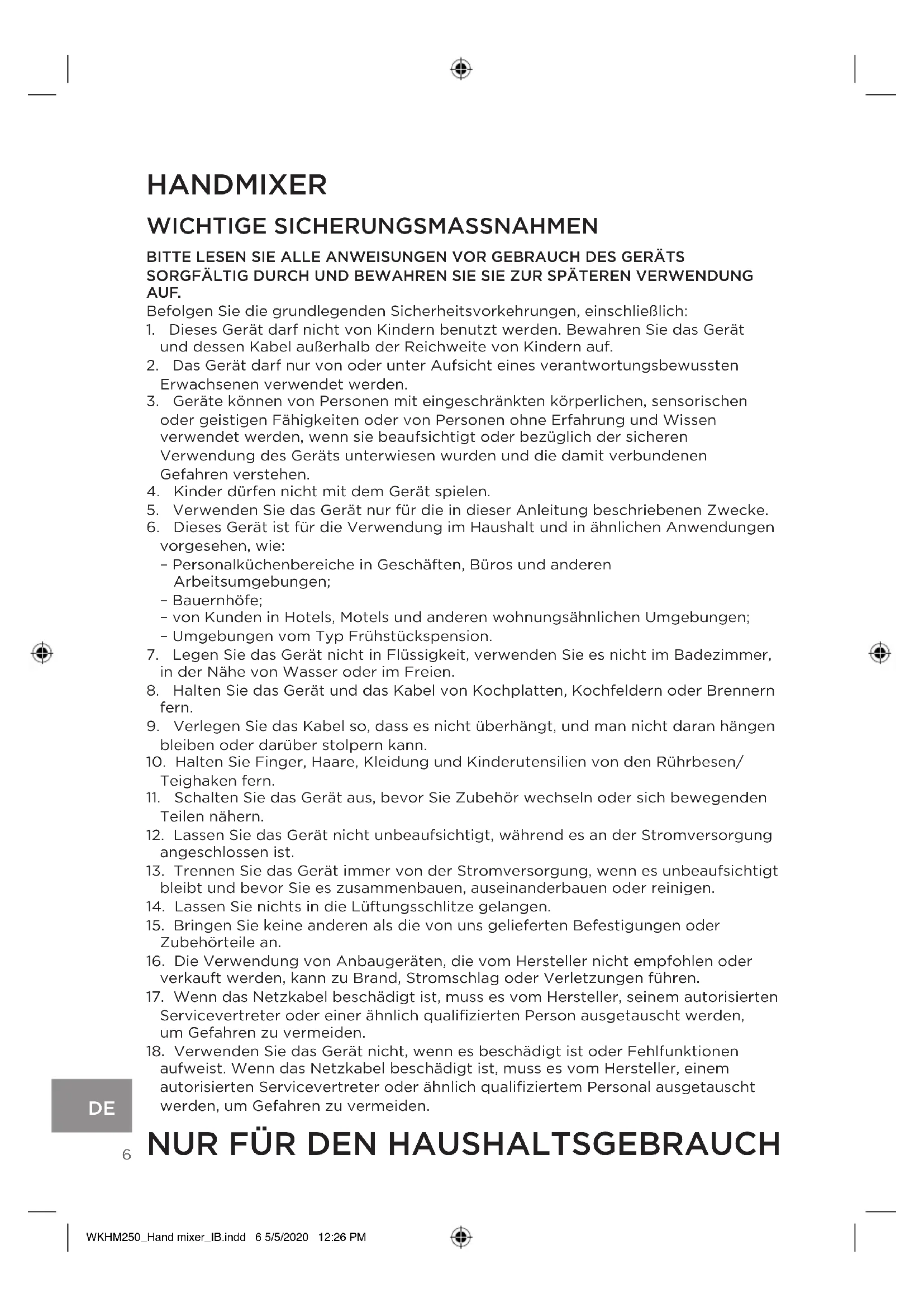 HANDMIXER WICHTIGE SICHERUNGSMASSNAHMEN BITTE LESEN SIE ALLE ANWEISUNGEN VOR GEBRAUCH DES GERÄTS SORGFÄLTIG DURCH UND BEWAHREN SIE SIE ZUR SPÄTEREN VERWENDUNG AUF. Befolgen Sie die grundlegenden Sicherheitsvorkehrungen, einschließlich: