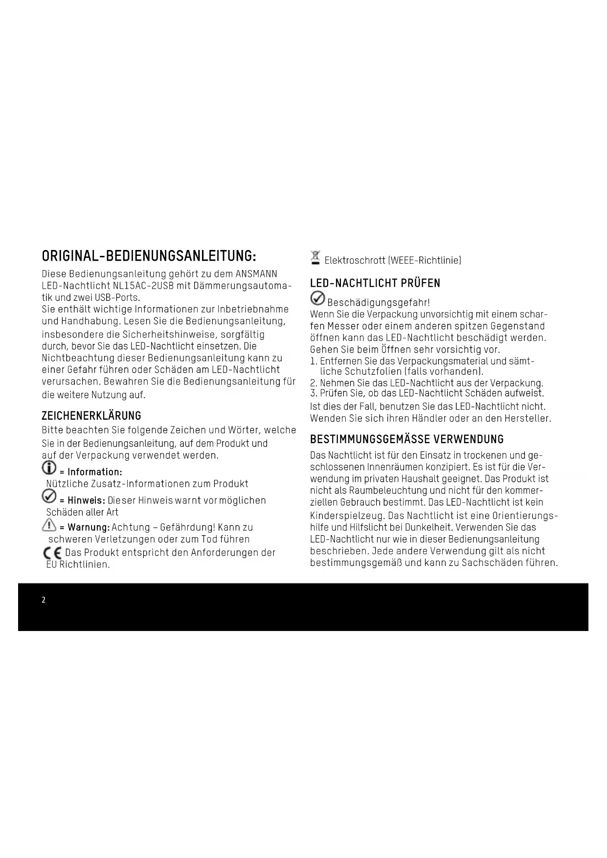 JAHRE GARANTIE YEARS WARRANTY2 ORIGINAL-BEDIENUNGSANLEITUNG: Diese Bedienungsanleitung gehört zu dem ANSMANN LED-Nachtlicht NL15AC-2USB mit Dämmerungsautoma- tik und zwei USB-Ports. Sie enthält wichtige Informationen zur Inbetriebnahme und Handhabung. Lesen Sie die Bedienungsanleitung, insbesondere die Sicherheitshinweise, sorgfältig durch, bevor Sie das LED-Nachtlicht einsetzen. Die Nichtbeachtung dieser Bedienungsanleitung kann zu einer Gefahr führen oder Schäden am LED-Nachtlicht verursachen. Bewahren Sie die Bedienungsanleitung für die weitere Nutzung auf. ZEICHENERKLÄRUNG Bitte beachten Sie folgende Zeichen und Wörter, welche Sie in der Bedienungsanleitung, auf dem Produkt und auf der Verpackung verwendet werden. = Information: Nützliche Zusatz-Informationen zum Produkt = Hinweis: Dieser Hinweis warnt vor möglichen Schäden aller Art = Warnung: Achtung – Gefährdung! Kann zu schweren Verletzungen oder zum Tod führen Das Produkt entspricht den Anforderungen der EU Richtlinien. Elektroschrott (WEEE-Richtlinie)