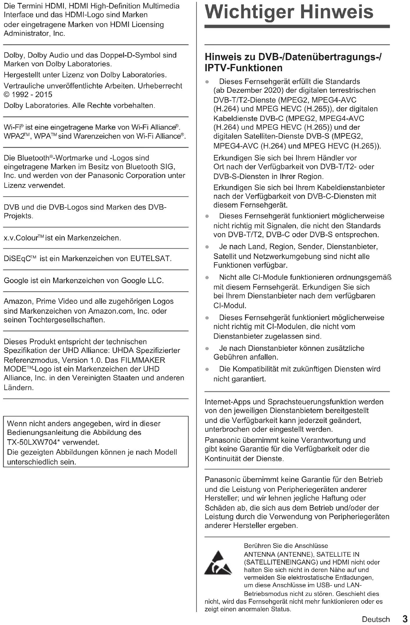 -Logo ist ein Markenzeichen der UHD Alliance, Inc. in den Vereinigten Staaten und anderen Ländern. Wenn nicht anders angegeben, wird in dieser Bedienungsanleitung die Abbildung des TX-50LXW704* verwendet. Die gezeigten Abbildungen können je nach Modell unterschiedlich sein. Wichtiger Hinweis Hinweis zu DVB-/Datenübertragungs-/ IPTV-Funktionen ● Dieses Fernsehgerät erfüllt die Standards (ab Dezember 2020) der digitalen terrestrischen DVB-T/T2-Dienste (MPEG2, MPEG4-AVC (H.264) und MPEG HEVC (H.265)), der digitalen Kabeldienste DVB-C (MPEG2, MPEG4-AVC (H.264) und MPEG HEVC (H.265)) und der digitalen Satelliten-Dienste DVB-S (MPEG2, MPEG4-AVC (H.264) und MPEG HEVC (H.265)). Erkundigen Sie sich bei Ihrem Händler vor Ort nach der Verfügbarkeit von DVB-T/T2- oder DVB-S-Diensten in Ihrer Region. Erkundigen Sie sich bei Ihrem Kabeldienstanbieter nach der Verfügbarkeit von DVB-C-Diensten mit diesem Fernsehgerät. ● Dieses Fernsehgerät funktioniert möglicherweise nicht richtig mit Signalen, die nicht den Standards von DVB-T/T2, DVB-C oder DVB-S entsprechen. ● Je nach Land, Region, Sender, Dienstanbieter, Satellit und Netzwerkumgebung sind nicht alle Funktionen verfügbar. ● Nicht alle CI-Module funktionieren ordnungsgemäß mit diesem Fernsehgerät. Erkundigen Sie sich bei Ihrem Dienstanbieter nach dem verfügbaren CI-Modul. ● Dieses Fernsehgerät funktioniert möglicherweise nicht richtig mit CI-Modulen, die nicht vom Dienstanbieter zugelassen sind. ● Je nach Dienstanbieter können zusätzliche Gebühren anfallen. ● Die Kompatibilität mit zukünftigen Diensten wird nicht garantiert. Internet-Apps und Sprachsteuerungsfunktion werden von den jeweiligen Dienstanbietern bereitgestellt und die Verfügbarkeit kann jederzeit geändert, unterbrochen oder eingestellt werden. Panasonic übernimmt keine Verantwortung und gibt keine Garantie für die Verfügbarkeit oder die Kontinuität der Dienste. Panasonic übernimmt keine Garantie für den Betrieb und die Leistung von Peripheriegeräten anderer Hersteller; und wir lehnen jegliche Haftung oder Schäden ab, die sich aus dem Betrieb und/oder der Leistung durch die Verwendung von Peripheriegeräten anderer Hersteller ergeben. Berühren Sie die Anschlüsse