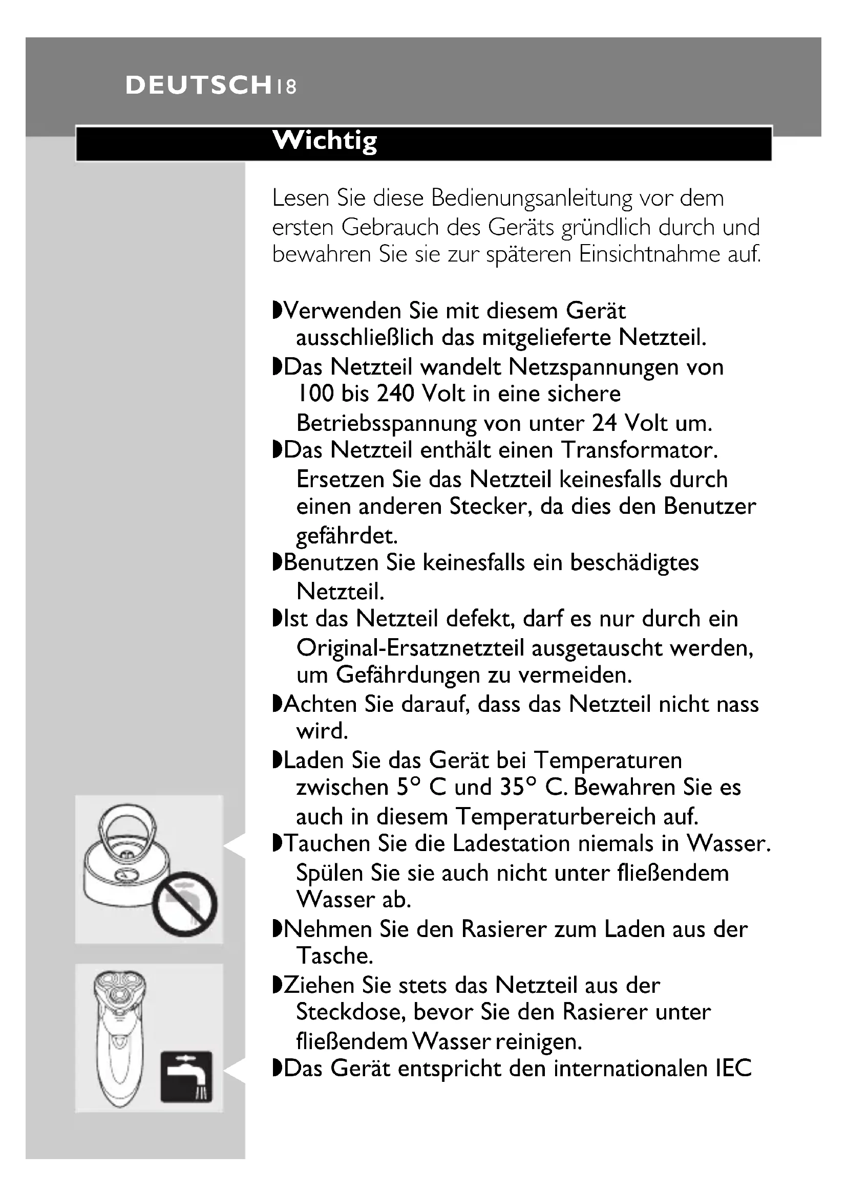 Cause: the shaving unit has not been placed correctly. ◗ If the shaving unit becomes detached from the shaver, you can easily reattach it ('click'). ENGLISH 17Wichtig Lesen Sie diese Bedienungsanleitung vor dem ersten Gebrauch des Geräts gründlich durch und bewahren Sie sie zur späteren Einsichtnahme auf. ◗ Verwenden Sie mit diesem Gerät ausschließlich das mitgelieferte Netzteil. ◗ Das Netzteil wandelt Netzspannungen von 100 bis 240 Volt in eine sichere Betriebsspannung von unter 24 Volt um. ◗ Das Netzteil enthält einen Transformator. Ersetzen Sie das Netzteil keinesfalls durch einen anderen Stecker, da dies den Benutzer gefährdet. ◗ Benutzen Sie keinesfalls ein beschädigtes Netzteil. ◗ Ist das Netzteil defekt, darf es nur durch ein Original-Ersatznetzteil ausgetauscht werden, um Gefährdungen zu vermeiden. ◗ Achten Sie darauf, dass das Netzteil nicht nass wird. ◗ Laden Sie das Gerät bei Temperaturen zwischen 5c C und 35c C. Bewahren Sie es auch in diesem Temperaturbereich auf.
