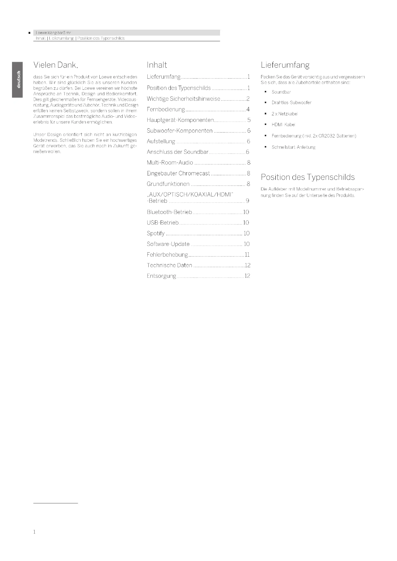 - Loewe klang bar5 mr deutsch deutsch Inhalt | Lieferumfang | Position des Typenschilds Vielen Dank, dass Sie sich für ein Produkt von Loewe entschieden haben. Wir sind glücklich Sie als unseren Kunden begrüßen zu dürfen. Bei Loewe vereinen wir höchste Ansprüche an Technik, Design und Bedienkomfort. Dies gilt gleichermaßen für Fernsehgeräte, Videoaus- rüstung, Audiogeräte und Zubehör. Technik und Design erfüllen keinen Selbstzweck, sondern sollen in ihrem Zusammenspiel das bestmögliche Audio- und Video- erlebnis für unsere Kunden ermöglichen. Unser Design orientiert sich nicht an kurzlebigen Modetrends. Schließlich haben Sie ein hochwertiges Gerät erworben, das Sie auch noch in Zukunft ge- nießen wollen. Inhalt Lieferumfang p. 1