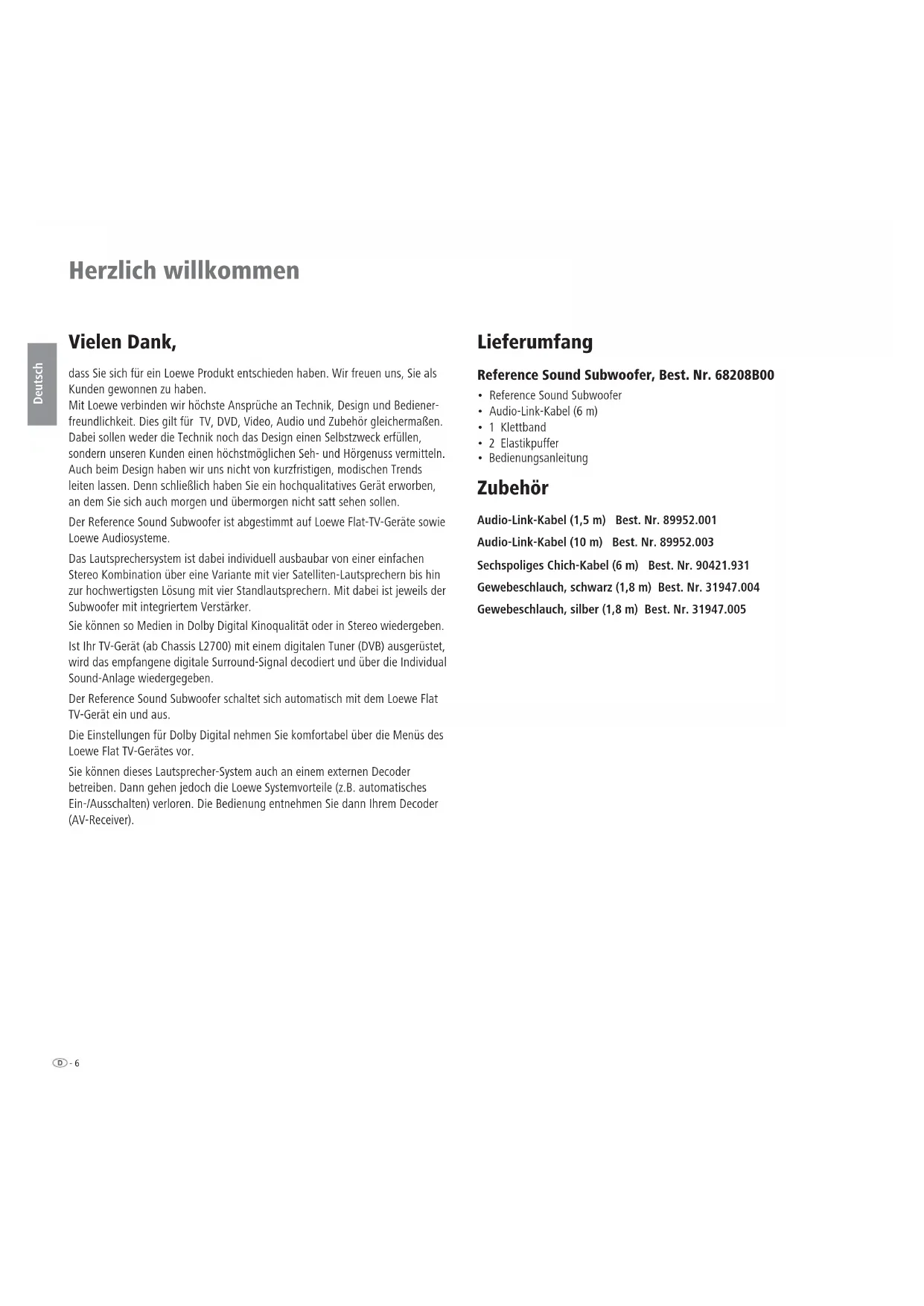 - Bedienungsanleitung Zubehör Audio-Link-Kabel (1,5 m) Best. Nr. 89952.001 Audio-Link-Kabel (10 m) Best. Nr. 89952.003 Sechspoliges Chich-Kabel (6 m) Best. Nr. 90421.931 Gewebeschlauch, schwarz (1,8 m) Best. Nr. 31947.004 Gewebeschlauch, silber (1,8 m) Best. Nr. 31947.0057 - Deutsch Entsorgung Verpackung und Karton Für die Entsorgung der Verpackung haben wir entsprechend den nationalen Ver- ordnungen ein Entgelt an beauftragte Verwerter entrichtet, die die Verpackung vom Fachhändler abholen. Dennoch empfehlen wir, den Originalkarton und das Verpackungsmaterial gut aufzubewahren, damit das Gerät im Bedarfsfall optimal geschützt transportiert werden kann. Das Gerät Achtung: Die EU-Richtlinie 2002/96/EG regelt die ordnungs- gemäße Rücknahme, Behandlung und Verwertung von gebrauchten Elektronikgeräten. Elektronische Altgeräte müssen deshalb getrennt entsorgt wer- den. Werfen Sie dieses Gerät zur Entsorgung bitte nicht in den normalen Hausmüll! Sie können Ihr Altgerät kostenlos an aus- gewiesene Rücknahmestellen oder ggf. bei Ihrem Fachhändler abgeben, wenn Sie ein vergleichbares neues Gerät kaufen. Weitere Einzelheiten über die Rücknahme (auch für Nicht-EU Länder) erhalten Sie von Ihrer örtlichen Verwaltung. Reinigen Reinigen Sie Ihr Reference Lautsprecher-System nur mit einem feuchten, wei- chen und sauberen Tuch (ohne jedes scharfe Reinigungsmittel). Zu Ihrer Sicherheit Zu Ihrer eigenen Sicherheit und um unnötigen Schaden von Ihrem Gerät abzu- wenden, lesen und beachten Sie die nachfolgenden Sicherheitshinweise: