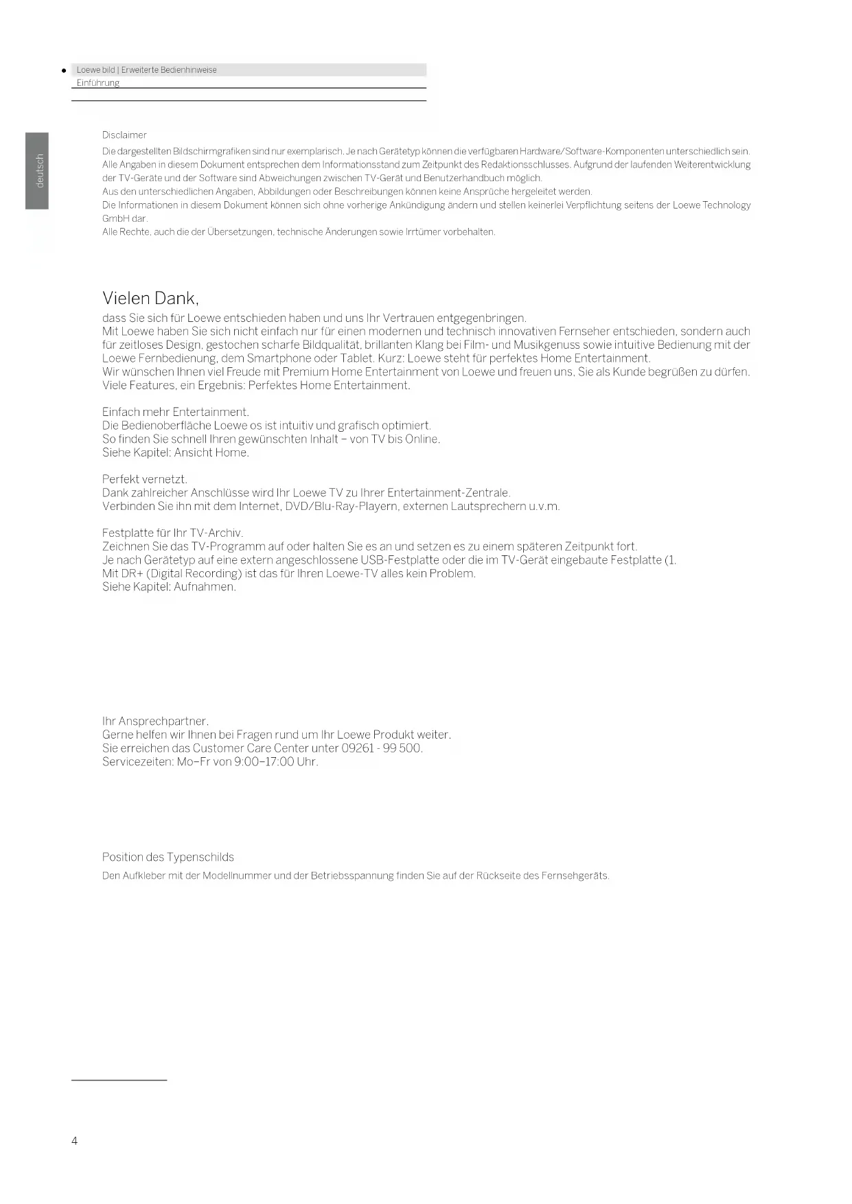 Loewe bild | Erweiterte BedienhinweiseEinführung Disclaimer Die dargestellten Bildschirmgrafiken sind nur exemplarisch Je nach Gerätetyp können die verfügbaren Hardware/Software-Komponenten unterschiedlich sein Alle Angaben in diesem Dokument entsprechen dem Informationsstand zum Zeitpunkt des Redaktionsschlusses Aufgrund der laufenden Weiterentwicklung der TV-Geräte und der Software sind Abweichungen zwischen TV-Gerät und Benutzerhandbuch möglich Aus den unterschiedlichen Angaben, Abbildungen oder Beschreibungen können keine Ansprüche hergeleitet werden Die Informationen in diesem Dokument können sich ohne vorherige Ankündigung ändern und stellen keinerlei Verpflichtung seitens der Loewe Technology GmbH dar Alle Rechte, auch die der Übersetzungen, technische Änderungen sowie Irrtümer vorbehalten Vielen Dank, dass Sie sich für Loewe entschieden haben und uns Ihr Vertrauen entgegenbringen Mit Loewe haben Sie sich nicht einfach nur für einen modernen und technisch innovativen Fernseher entschieden, sondern auch für zeitloses Design, gestochen scharfe Bildqualität, brillanten Klang bei Film- und Musikgenuss sowie intuitive Bedienung mit der Loewe Fernbedienung, dem Smartphone oder Tablet Kurz: Loewe steht für perfektes Home Entertainment Wir wünschen Ihnen viel Freude mit Premium Home Entertainment von Loewe und freuen uns, Sie als Kunde begrüßen zu dürfen Viele Features, ein Ergebnis: Perfektes Home Entertainment Einfach mehr Entertainment Die Bedienoberfläche Loewe os ist intuitiv und grafisch optimiert So finden Sie schnell Ihren gewünschten Inhalt – von TV bis Online Siehe Kapitel: Ansicht Home Perfekt vernetzt Dank zahlreicher Anschlüsse wird Ihr Loewe TV zu Ihrer Entertainment-Zentrale Verbinden Sie ihn mit dem Internet, DVD/Blu-Ray-Playern, externen Lautsprechern uvm Festplatte für Ihr TV-Archiv Zeichnen Sie das TV-Programm auf oder halten Sie es an und setzen es zu einem späteren Zeitpunkt fort Je nach Gerätetyp auf eine extern angeschlossene USB-Festplatte oder die im TV-Gerät eingebaute Festplatte (1 Mit DR+ (Digital Recording) ist das für Ihren Loewe-TV alles kein Problem Siehe Kapitel: Aufnahmen Ihr Ansprechpartner Gerne helfen wir Ihnen bei Fragen rund um Ihr Loewe Produkt weiter Sie erreichen das Customer Care Center unter 09261 - 99 500 Servicezeiten: Mo–Fr von 9:00–17:00 Uhr Position des Typenschilds Den Aufkleber mit der Modellnummer und der Betriebsspannung finden Sie auf der Rückseite des Fernsehgeräts5 deutsch