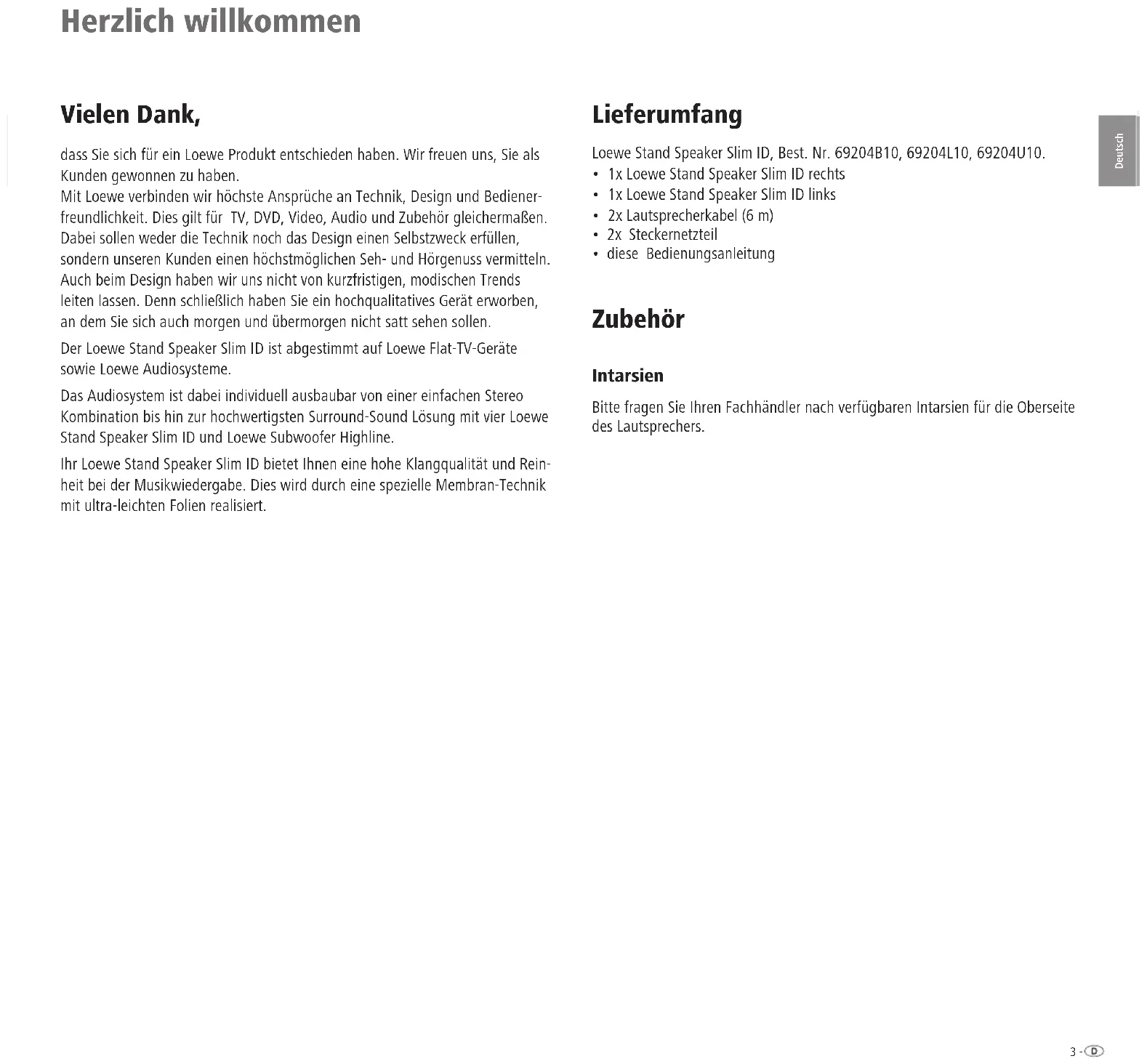 ng3 - Deutsch Herzlich willkommen Vielen Dank, dass Sie sich für ein Loewe Produkt entschieden haben. Wir freuen uns, Sie als Kunden gewonnen zu haben. Mit Loewe verbinden wir höchste Ansprüche an Technik, Design und Bediener- freundlichkeit. Dies gilt für TV, DVD, Video, Audio und Zubehör gleichermaßen. Dabei sollen weder die Technik noch das Design einen Selbstzweck erfüllen, sondern unseren Kunden einen höchstmöglichen Seh- und Hörgenuss vermitteln. Auch beim Design haben wir uns nicht von kurzfristigen, modischen Trends leiten lassen. Denn schließlich haben Sie ein hochqualitatives Gerät erworben, an dem Sie sich auch morgen und übermorgen nicht satt sehen sollen. Der Loewe Stand Speaker Slim ID ist abgestimmt auf Loewe Flat-TV-Geräte sowie Loewe Audiosysteme. Das Audiosystem ist dabei individuell ausbaubar von einer einfachen Stereo Kombination bis hin zur hochwertigsten Surround-Sound Lösung mit vier Loewe Stand Speaker Slim ID und Loewe Subwoofer Highline. Ihr Loewe Stand Speaker Slim ID bietet Ihnen eine hohe Klangqualität und Rein- heit bei der Musikwiedergabe. Dies wird durch eine spezielle Membran-Technik mit ultra-leichten Folien realisiert. Lieferumfang Loewe Stand Speaker Slim ID, Best. Nr. 69204B10, 69204L10, 69204U10.