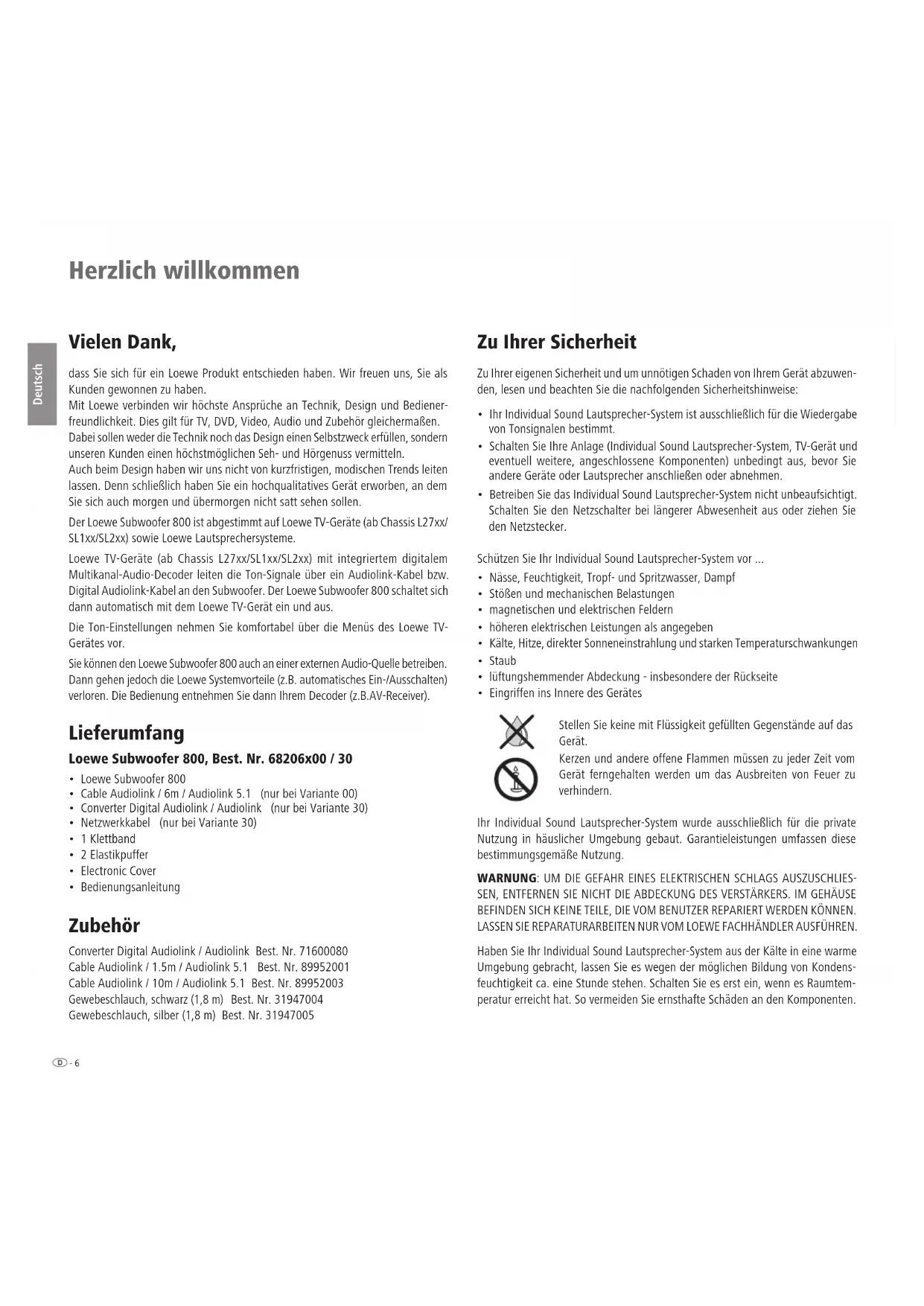 - Bedienungsanleitung Zubehör Converter Digital Audiolink / Audiolink Best. Nr. 71600080 Cable Audiolink / 1.5m / Audiolink 5.1 Best. Nr. 89952001 Cable Audiolink / 10m / Audiolink 5.1 Best. Nr. 89952003 Gewebeschlauch, schwarz (1,8 m) Best. Nr. 31947004 Gewebeschlauch, silber (1,8 m) Best. Nr. 31947005 Zu Ihrer Sicherheit Zu Ihrer eigenen Sicherheit und um unnötigen Schaden von Ihrem Gerät abzuwen- den, lesen und beachten Sie die nachfolgenden Sicherheitshinweise: