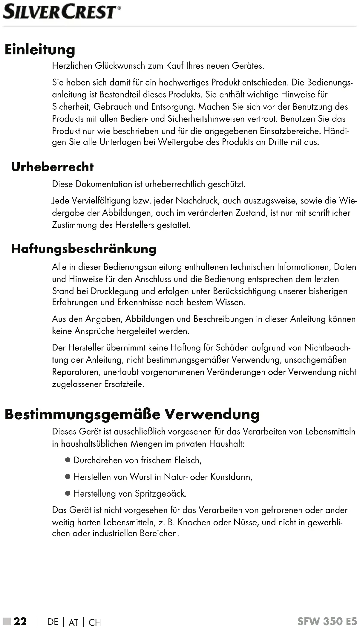 SFW 350 E5 Einleitung Herzlichen Glückwunsch zum Kauf Ihres neuen Gerätes. Sie haben sich damit für ein hochwertiges Produkt entschieden. Die Bedienungs- anleitung ist Bestandteil dieses Produkts. Sie enthält wichtige Hinweise für Sicherheit, Gebrauch und Entsorgung. Machen Sie sich vor der Benutzung des Produkts mit allen Bedien- und Sicherheitshinweisen vertraut. Benutzen Sie das Produkt nur wie beschrieben und für die angegebenen Einsatzbereiche. Händi- gen Sie alle Unterlagen bei Weitergabe des Produkts an Dritte mit aus. Urheberrecht Diese Dokumentation ist urheberrechtlich geschützt. Jede Vervielfältigung bzw. jeder Nachdruck, auch auszugsweise, sowie die Wie- dergabe der Abbildungen, auch im veränderten Zustand, ist nur mit schriftlicher Zustimmung des Herstellers gestattet. Haftungsbeschränkung Alle in dieser Bedienungsanleitung enthaltenen technischen Informationen, Daten und Hinweise für den Anschluss und die Bedienung entsprechen dem letzten Stand bei Drucklegung und erfolgen unter Berücksichtigung unserer bisherigen Erfahrungen und Erkenntnisse nach bestem Wissen. Aus den Angaben, Abbildungen und Beschreibungen in dieser Anleitung können keine Ansprüche hergeleitet werden. Der Hersteller übernimmt keine Haftung für Schäden aufgrund von Nichtbeach- tung der Anleitung, nicht bestimmungsgemäßer Verwendung, unsachgemäßen Reparaturen, unerlaubt vorgenommenen Veränderungen oder Verwendung nicht zugelassener Ersatzteile. Bestimmungsgemäße Verwendung Dieses Gerät ist ausschließlich vorgesehen für das Verarbeiten von Lebensmitteln in haushaltsüblichen Mengen im privaten Haushalt: ▯ Durchdrehen von frischem Fleisch, ▯ Herstellen von Wurst in Natur- oder Kunstdarm, ▯ Herstellung von Spritzgebäck. Das Gerät ist nicht vorgesehen für das Verarbeiten von gefrorenen oder ander- weitig harten Lebensmitteln, z. B. Knochen oder Nüsse, und nicht in gewerbli- chen oder industriellen Bereichen.DE