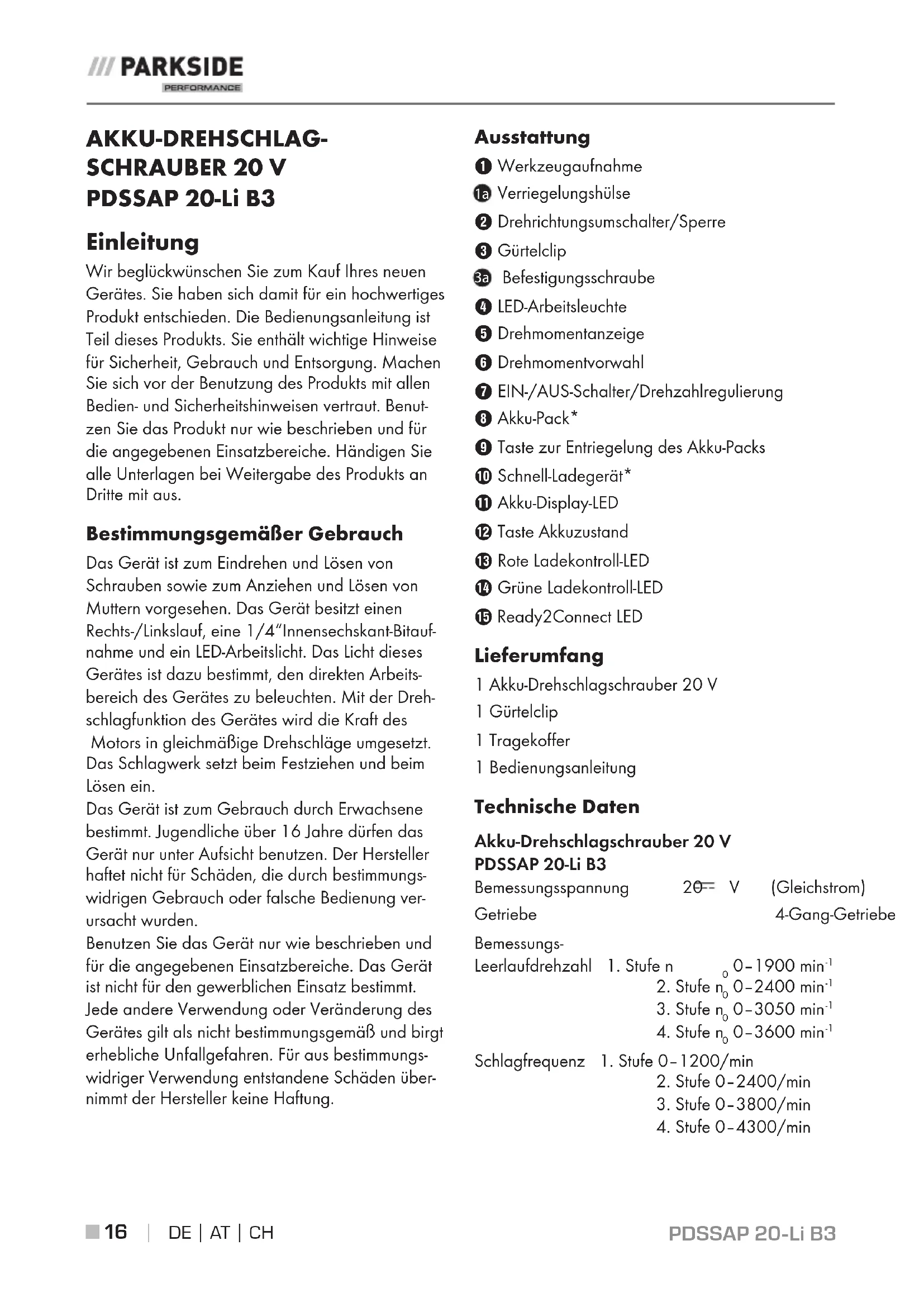 AKKU-DREHSCHLAG- SCHRAUBER 20 V PDSSAP 20-Li B3 Einleitung Wir beglückwünschen Sie zum Kauf Ihres neuen Gerätes. Sie haben sich damit für ein hochwertiges Produkt entschieden. Die Bedienungsanleitung ist Teil dieses Produkts. Sie enthält wichtige Hinweise für Sicherheit, Gebrauch und Entsorgung. Machen Sie sich vor der Benutzung des Produkts mit allen Bedien- und Sicherheitshinweisen vertraut. Benut- zen Sie das Produkt nur wie beschrieben und für die angegebenen Einsatzbereiche. Händigen Sie alle Unterlagen bei Weitergabe des Produkts an Dritte mit aus. Bestimmungsgemäßer Gebrauch Das Gerät ist zum Eindrehen und Lösen von Schrauben sowie zum Anziehen und Lösen von Muttern vorgesehen. Das Gerät besitzt einen Rechts-/Linkslauf, eine 1/4“Innensechskant-Bitauf- nahme und ein LED-Arbeitslicht. Das Licht dieses Gerätes ist dazu bestimmt, den direkten Arbeits- bereich des Gerätes zu beleuchten. Mit der Dreh- schlagfunktion des Gerätes wird die Kraft des Motors in gleichmäßige Drehschläge umgesetzt. Das Schlagwerk setzt beim Festziehen und beim Lösen ein. Das Gerät ist zum Gebrauch durch Erwachsene bestimmt. Jugendliche über 16 Jahre dürfen das Gerät nur unter Aufsicht benutzen. Der Hersteller haftet nicht für Schäden, die durch bestimmungs- widrigen Gebrauch oder falsche Bedienung ver- ursacht wurden. Benutzen Sie das Gerät nur wie beschrieben und für die angegebenen Einsatzbereiche. Das Gerät ist nicht für den gewerblichen Einsatz bestimmt. Jede andere Verwendung oder Veränderung des Gerätes gilt als nicht bestimmungsgemäß und birgt erhebliche Unfallgefahren. Für aus bestimmungs- widriger Verwendung entstandene Schäden über- nimmt der Hersteller keine Haftung. Ausstattung 1 Werkzeugaufnahme