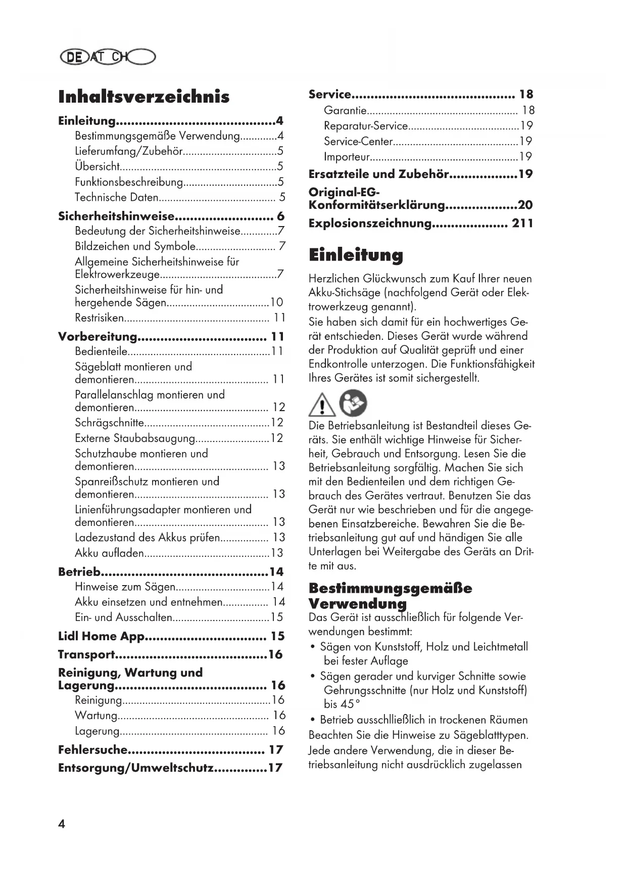 - Explosionszeichnung Einleitung Herzlichen Glückwunsch zum Kauf Ihrer neuen Akku-Stichsäge (nachfolgend Gerät oder Elek- trowerkzeug genannt). Sie haben sich damit für ein hochwertiges Ge- rät entschieden. Dieses Gerät wurde während der Produktion auf Qualität geprüft und einer Endkontrolle unterzogen. Die Funktionsfähigkeit Ihres Gerätes ist somit sichergestellt. Die Betriebsanleitung ist Bestandteil dieses Ge- räts. Sie enthält wichtige Hinweise für Sicher- heit, Gebrauch und Entsorgung. Lesen Sie die Betriebsanleitung sorgfältig. Machen Sie sich mit den Bedienteilen und dem richtigen Ge- brauch des Gerätes vertraut. Benutzen Sie das Gerät nur wie beschrieben und für die angege- benen Einsatzbereiche. Bewahren Sie die Be- triebsanleitung gut auf und händigen Sie alle Unterlagen bei Weitergabe des Geräts an Drit- te mit aus. Bestimmungsgemäße Verwendung Das Gerät ist ausschließlich für folgende Ver- wendungen bestimmt: p. 211