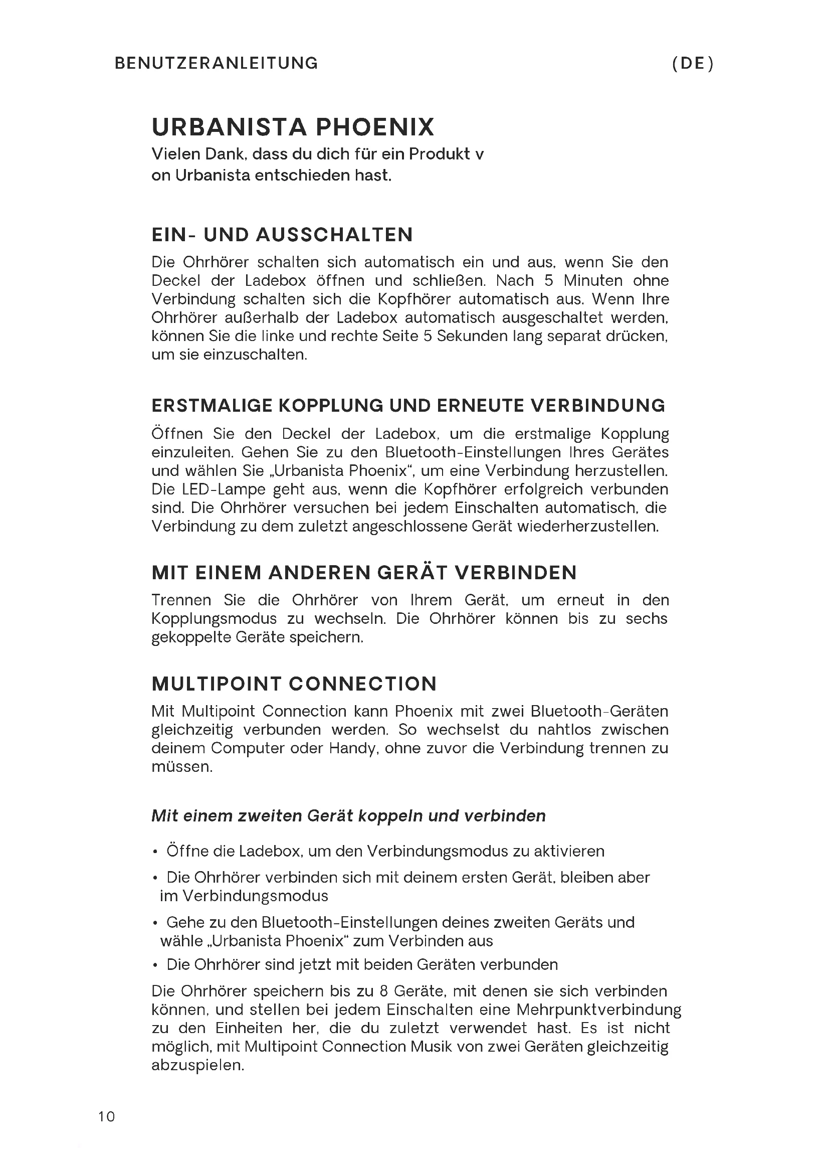 (ES)10 BENUTZERANLEITUNG (DE) URBANISTA PHOENIX Vielen Dank, dass du dich für ein Produkt v on Urbanista entschieden hast.