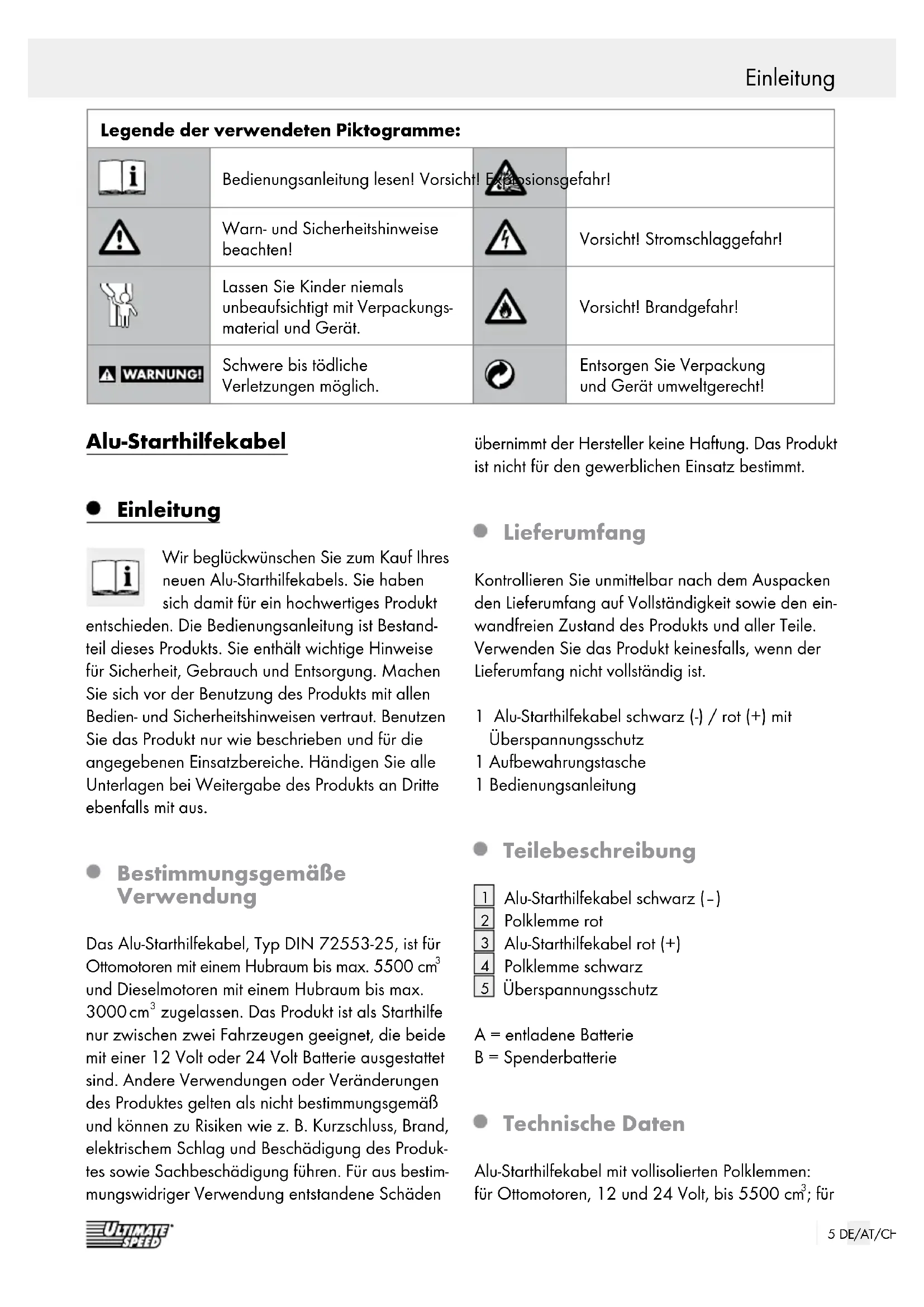 KLEINKINDER UND KINDER! Lassen Sie Kinder niemals unbeaufsichtigt mit dem Verpackungsmaterial. Es besteht Erstickungs- gefahr. Halten Sie das Produkt von Kindern fern. Dieses Produkt ist kein Spielzeug, es gehört nicht in Kinderhände. Kinder können die Gefahren, die im Umgang mit dem Produkt entstehen, nicht erkennen. LEBENSGEFAHR! Halten Sie Kinder während des Gebrauchs des Produkts vom Arbeitsbereich fern. Dieses Gerät kann von Kindern ab 8 Jahren und darüber sowie von Personen mit verringerten physischen, sensorischen oder mentalen Fähig- keiten oder Mangel an Erfahrung und Wissen benutzt werden, wenn sie beaufsichtigt oder bezüglich des sicheren Gebrauchs des Gerätes unterwiesen wurden und die daraus resultieren- den Gefahren verstehen. Kinder dürfen nicht mit dem Gerät spielen. Reinigung und Benutzerwar- tung dürfen nicht von Kindern ohne Beaufsichti- gung durchgeführt werden. VORSICHT! EXPLOSIONSGE- FAHR! Verwenden Sie das Alu-Starthilfekabel nicht in explosions- gefährdeter Umgebung, in der sich brennbare Dämpfe, Gase oder Stäube befinden. Bewahren Sie die Gebrauchsanweisung für den weiteren Gebrauch auf. Sollte dieses Produkt an Dritte weitergegeben werden, muss diese Gebrauchsanweisung mit ausgehändigt wer den. Lebensgefahr durch elektrischen Schlag Überprüfen Sie vor jedem Gebrauch das Alu-Start- hilfekabel auf etwaige Beschädigungen. Benutzen Sie das Alu-Starthilfekabel niemals, wenn Sie irgendwelche Beschädigungen feststellen. VORSICHT! Beschädigte Leitungen bedeuten Lebensgefahr durch elektrischen Schlag. Wen- den Sie sich bei Beschädigungen, Reparaturen oder anderen Problemen an dem Produkt an die Servicestelle oder eine Elektrofachkraft. Öffnen Sie niemals eines der elektrischen Be triebs- mittel (Leitungen) oder stecken irgendwelche Gegenstände in dieselben. Derartige Eingriffe bedeuten Lebensgefahr durch elektrischen Schlag. Sicherheitshinweise zum Alu-Starthilfekabel Die Kapazität der stromgebenden Starterbatterie, z. B. 45 Ah, (Wagen B) darf nicht wesentlich un- ter der der entladenen Starterbatterie (Wagen A) liegen, sonst ist ein Starten des Fahrzeuges nicht möglich. Es besteht Überhitzungsgefahr. Es dürfen nur Batterien gleicher Nennspannung (12 oder 24 Volt) mit dem Alu-Starthilfekabel ver- bunden werden. Andernfalls besteht Kurzschluss- gefahr sowie die Gefahr der Beschädigung von Bordelektronik und elektrischen Komponenten. Zwischen den Fahrzeugen (Wagen A und B) darf kein Karosseriekontakt bestehen oder hergestellt werden. Andernfalls besteht Kurz- schlussgefahr. BRANDGEFAHR! Halten Sie Zündquellen (z. B. offenes Licht, brennende Zigarren, Zigaretten oder elektrische Funken) von den Starterbatterien fern. Sicherheit / Gebrauch des Alu-StarthilfekabelsEinleitung / Sicherheit7 DE/AT/CH VORSICHT! VERLETZUNGSGEFAHR! RISIKO VON AUGENVERLETZUNGEN! Nicht über Starterbatterien beugen. Der Elekt- rolyt ist auch bei niedrigen Temperaturen und unabhängig vom Ladezustand flüssig. Die entladene Starterbatterie (Wagen A) darf beim Starthilfevorgang nicht vom dazugehören- den Bordnetz getrennt werden. Die Zündungen der Fahrzeuge sind vor dem Anklemmen des Alu-Starthilfekabels auszuschalten und die Feststellbremse ist anzuziehen. Stellen Sie bei Schaltgetrieben den Schalthebel in die Leerlauf-Stellung, bei Automatikgetrieben den Wählhebel auf „P”. Legen Sie die Leitungen des Alu-Starthilfekabels so, dass diese nicht von drehenden Teilen im Motorraum erfasst werden können. Gebrauch des Alu-Starthilfekabels Anklemmen Hinweis: Überprüfen Sie zunächst, ob die beiden Batterien, Spenderbatterie (Wagen B) und entlade- ne Batterie (Wagen A), die gleiche Spannung (12 oder 24 Volt) haben und von annähernd gleicher Kapazität sind. Vergleichen Sie die Aufdrucke auf den Batterien! EXPLOSIONSGEFAHR! Schließen Sie auf keinen Fall den Minuspol an die entladene Batterie an, da die Gefahr des Funkenschlages besteht, bei dem sich explosive Gase entzünden können.