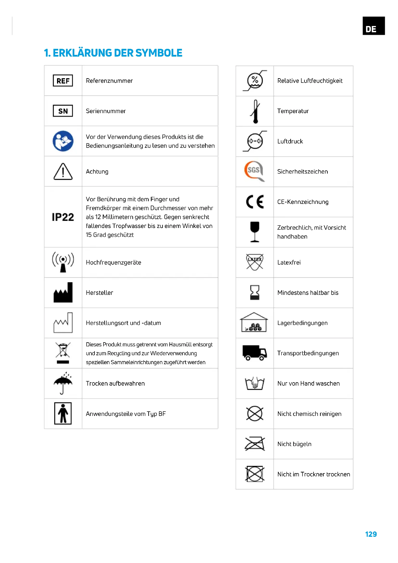 Seriennummer Vor der Verwendung dieses Produkts ist die Bedienungsanleitung zu lesen und zu verstehen Achtung Vor Berührung mit dem Finger und Fremdkörper mit einem Durchmesser von mehr als 12 Millimetern geschützt. Gegen senkrecht fallendes Tropfwasser bis zu einem Winkel von 15 Grad geschützt Hochfrequenzgeräte Hersteller Herstellungsort und -datum Dieses Produkt muss getrennt vom Hausmüll entsorgt und zum Recycling und zur Wiederverwendung speziellen Sammeleinrichtungen zugeführt werden Trocken aufbewahren Anwendungsteile vom Typ BF Relative Luftfeuchtigkeit Temperatur Luftdruck Sicherheitszeichen CE-Kennzeichnung Zerbrechlich, mit Vorsicht handhaben Latexfrei Mindestens haltbar bis Lagerbedingungen Transportbedingungen Nur von Hand waschen Nicht chemisch reinigen Nicht bügeln Nicht im Trockner trocknen130