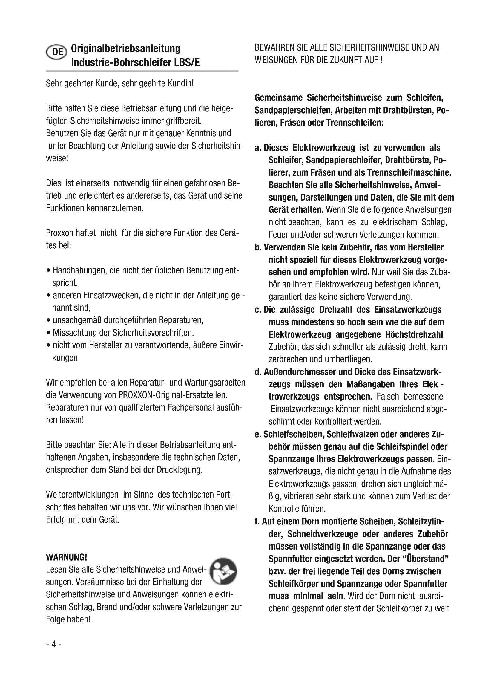 Fig. 2 Fig. 3 Fig. 4 Fig. 1- 4 - Originalbetriebsanleitung Industrie-Bohrschleifer LBS/E Sehr geehrter Kunde, sehr geehrte Kundin! Bitte halten Sie diese Betriebsanleitung und die beige- fügten Sicherheitshinweise immer griffbereit. Benutzen Sie das Gerät nur mit genauer Kenntnis und unter Beachtung der Anleitung sowie der Sicherheitshin- weise! Dies ist einerseits notwendig für einen gefahrlosen Be- trieb und erleichtert es andererseits, das Gerät und seine Funktionen kennenzulernen. Proxxon haftet nicht für die sichere Funktion des Gerä- tes bei: