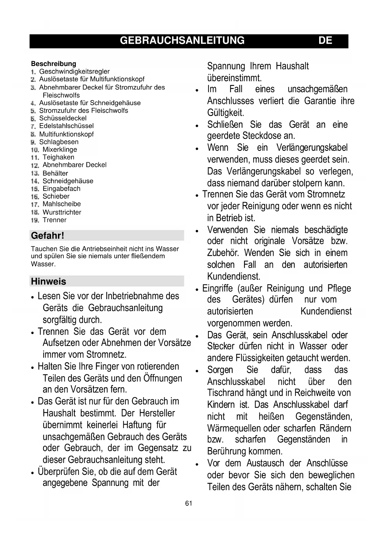 VÁM PŘEJE MNOHO PŘÍJEMNÝCH ZÁŽITKŮ PŘI POUŽÍVÁNÍ TOHOTO SPOTŘEBIČE Vyhrazujeme si právo na jakékoli úpravy!61 GEBRAUCHSANLEITUNG DE Beschreibung Geschwindigkeitsregler Auslösetaste für Multifunktionskopf Abnehmbarer Deckel für Stromzufuhr des Fleischwolfs Auslösetaste für Schneidgehäuse Stromzufuhr des Fleischwolfs Schüsseldeckel Edelstahlschüssel Multifunktionskopf Schlagbesen Mixerklinge Teighaken Abnehmbarer Deckel Behälter Schneidgehäuse Eingabefach Schieber Mahlscheibe Wursttrichter Trenner Gefahr! Tauchen Sie die Antriebseinheit nicht ins Wasser und spülen Sie sie niemals unter fließendem Wasser. Hinweis