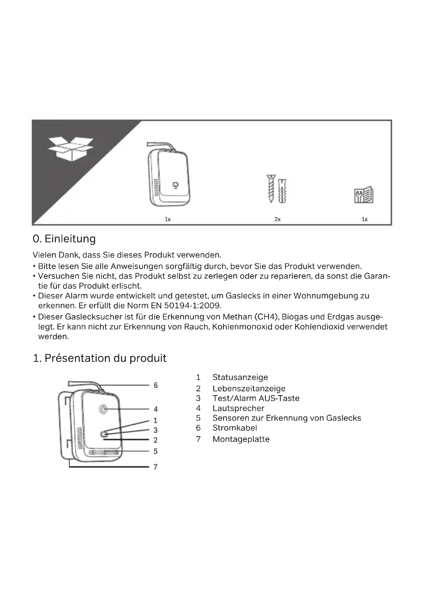 - Dieser Alarm wurde entwickelt und getestet, um Gaslecks in einer Wohnumgebung zu erkennen. Er erfüllt die Norm EN 50194-1:2009.
