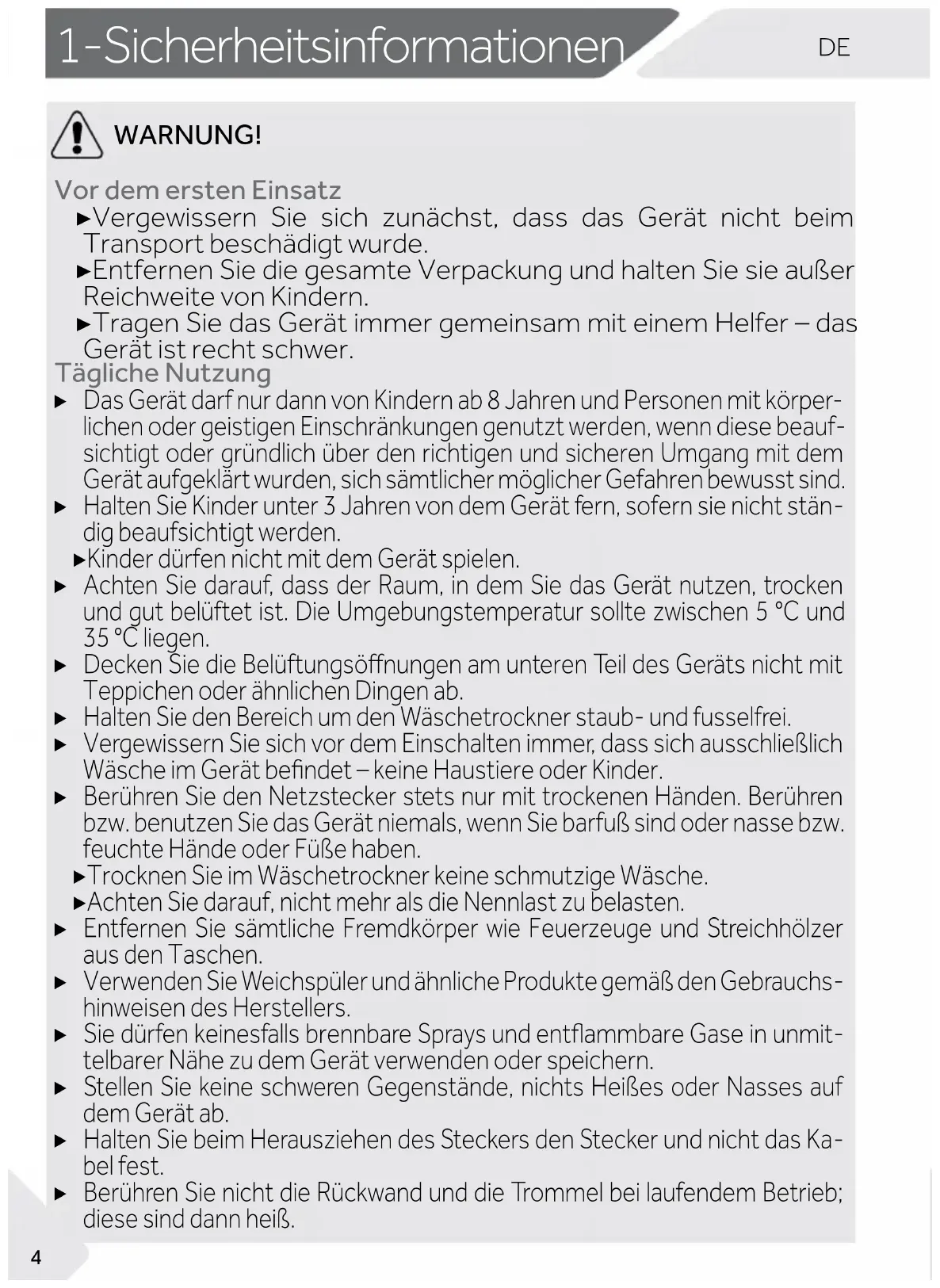 dig beaufsichtigt werden. ▶ Kinder dürfen nicht mit dem Gerät spielen. ▶ Achten Sie darauf, dass der Raum, in dem Sie das Gerät nutzen, trocken und gut belüftet ist. Die Umgebungstemperatur sollte zwischen 5 °C und 35 °C liegen. ▶ Decken Sie die Belüftungsönungen am unteren Teil des Geräts nicht mit Teppichen oder ähnlichen Dingen ab. ▶ Halten Sie den Bereich um den Wäschetrockner staub- und fusselfrei. ▶ Vergewissern Sie sich vor dem Einschalten immer, dass sich ausschließlich Wäsche im Gerät bendet – keine Haustiere oder Kinder. ▶ Berühren Sie den Netzstecker stets nur mit trockenen Händen. Berühren bzw. benutzen Sie das Gerät niemals, wenn Sie barfuß sind oder nasse bzw. feuchte Hände oder Füße haben. ▶ Trocknen Sie im Wäschetrockner keine schmutzige Wäsche. ▶ Achten Sie darauf, nicht mehr als die Nennlast zu belasten. ▶ Entfernen Sie sämtliche Fremdkörper wie Feuerzeuge und Streichhölzer aus den Taschen. ▶ Verwenden Sie Weichspüler und ähnliche Produkte gemäß den Gebrauchs