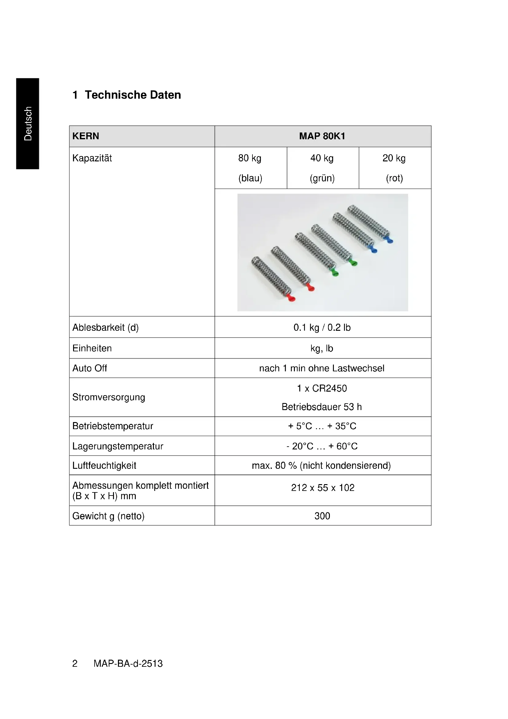 Einheiten kg, lb Auto Off nach 1 min ohne Lastwechsel Stromversorgung 1 x CR2450 Betriebsdauer 53 h Betriebstemperatur + 5°C … + 35°C Lagerungstemperatur - 20°C … + 60°C Luftfeuchtigkeit max. 80 % (nicht kondensierend) Abmessungen komplett montiert (B x T x H) mm 212 x 55 x 102 Gewicht g (netto) 300MAP-BA-d-2513 5 Deutsch