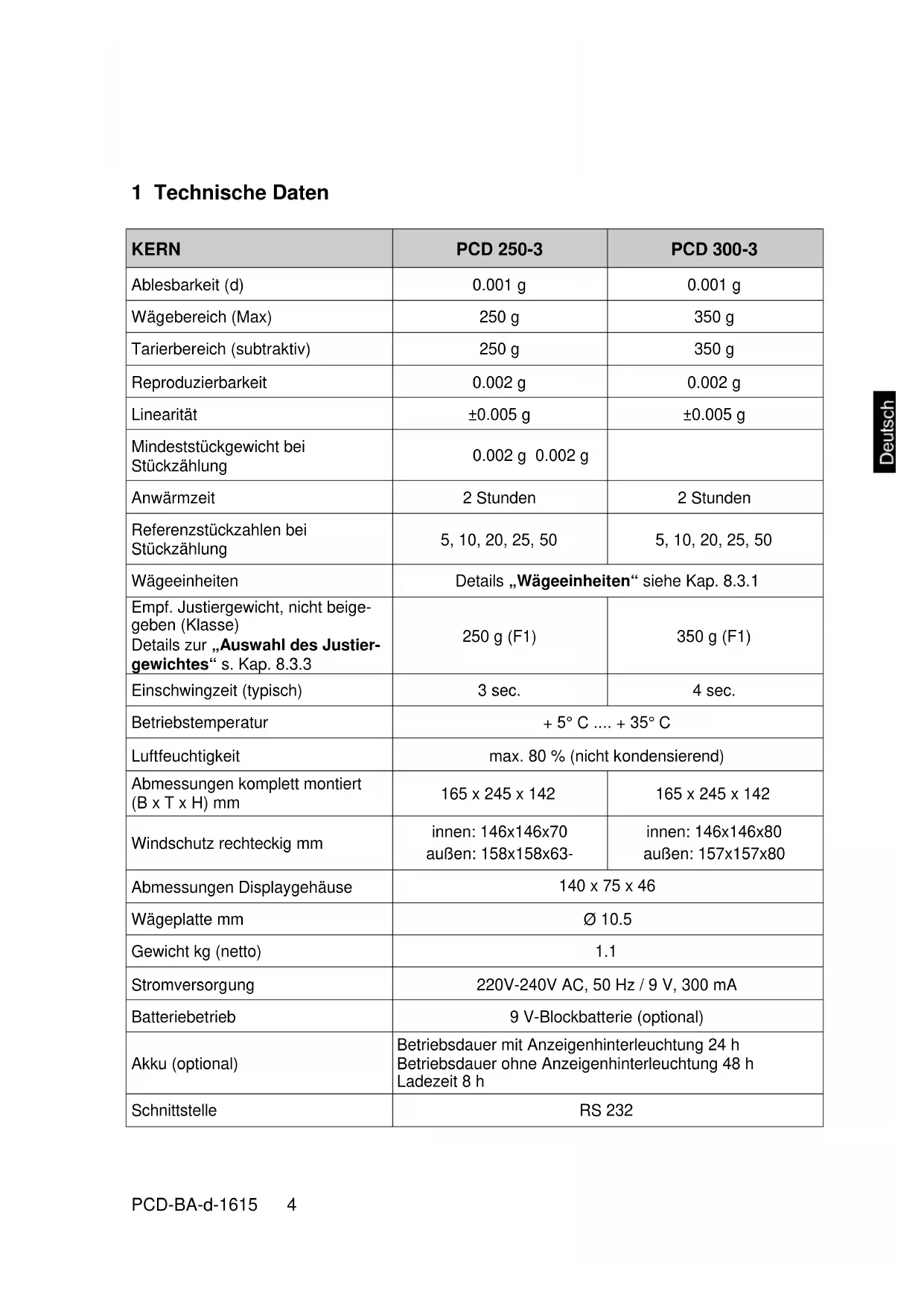 Anwärmzeit 2 Stunden 2 Stunden Referenzstückzahlen bei Stückzählung 5, 10, 20, 25, 50 Wägeeinheiten Details „Wägeeinheiten“ siehe Kap. 8.3.1 Empf. Justiergewicht, nicht beige- geben (Klasse) Details zur „Auswahl des Justier- gewichtes“ s. Kap. 8.3.3 2500 g (F1) 3 kg (F1) Einschwingzeit (typisch) 3 sec. Betriebstemperatur + 5° C .... + 35° C Luftfeuchtigkeit max. 80 % (nicht kondensierend) Abmessungen komplett montiert (B x T x H) mm 165 x 280 x 73 Abmessungen Displaygehäuse 140 x 75 x 46 Wägeplatte mm 160 x 160 Gewicht kg (netto) 1.6 1.9 Stromversorgung 220V-240V AC, 50 Hz / 9 V, 300 mA Batteriebetrieb 9 V-Blockbatterie (optional) Akku (optional) Betriebsdauer mit Anzeigenhinterleuchtung 24 h Betriebsdauer ohne Anzeigenhinterleuchtung 48 h Ladezeit 8 h Schnittstelle RS 232PCD-BA-d-1615 6 KERN PCD 6K-4 PCD 10K0.1 PCD 10K3 Ablesbarkeit (d) 0.1 g 0.1 g 1 g Wägebereich (Max) 6000 g 10 kg 10 kg Tarierbereich (subtraktiv) 6000 g 10 kg 10 kg Reproduzierbarkeit 0.1 g 0.1 g 1 g Linearität ±0.3 g ±0.3 g ±3 g Mindeststückgewicht bei Stückzählung