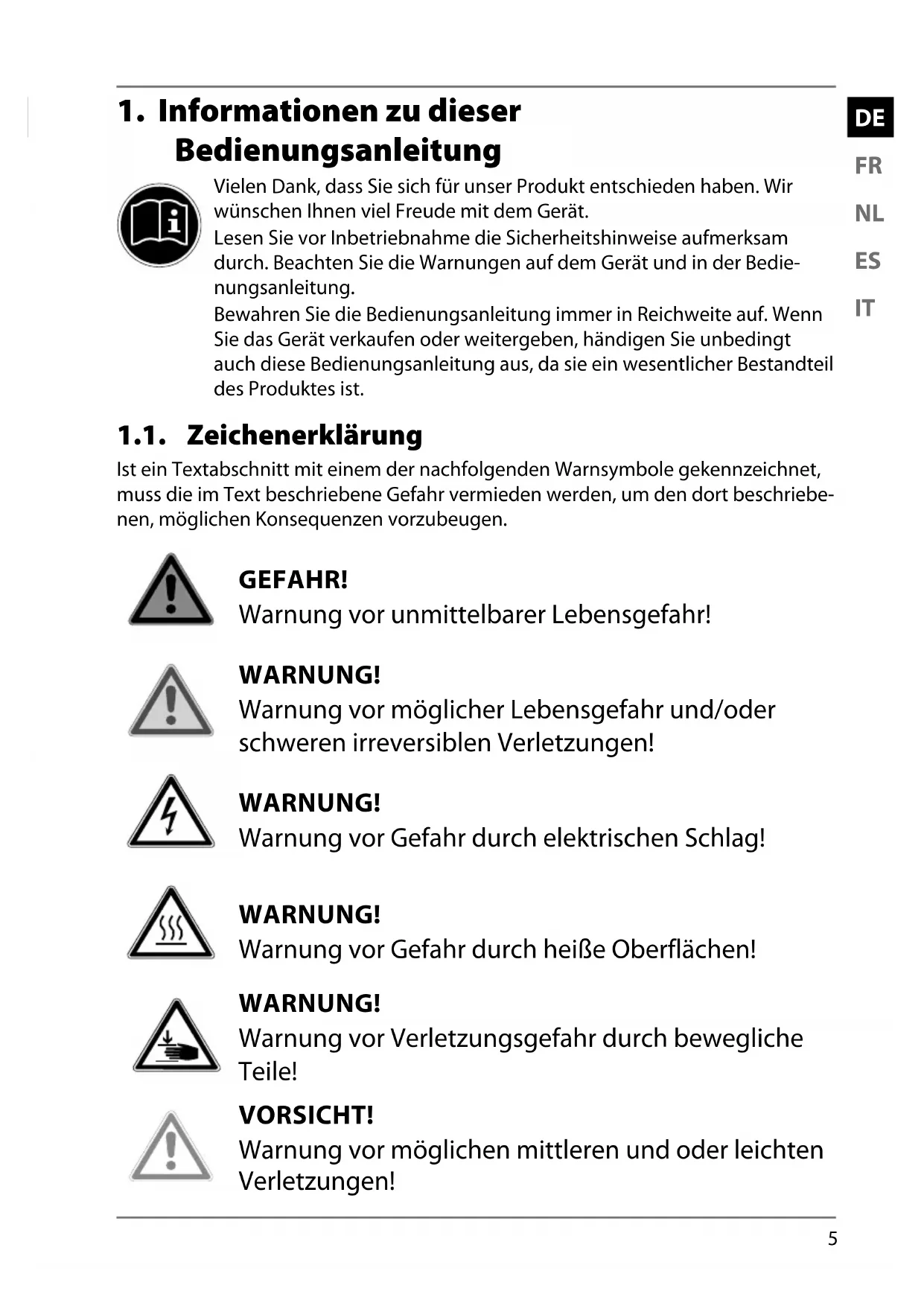 Bedienungsanleitung Vielen Dank, dass Sie sich für unser Produkt entschieden haben. Wir wünschen Ihnen viel Freude mit dem Gerät. Lesen Sie vor Inbetriebnahme die Sicherheitshinweise aufmerksam durch. Beachten Sie die Warnungen auf dem Gerät und in der Bedie- nungsanleitung. Bewahren Sie die Bedienungsanleitung immer in Reichweite auf. Wenn Sie das Gerät verkaufen oder weitergeben, händigen Sie unbedingt auch diese Bedienungsanleitung aus, da sie ein wesentlicher Bestandteil des Produktes ist. 1.1. Zeichenerklärung Ist ein Textabschnitt mit einem der nachfolgenden Warnsymbole gekennzeichnet, muss die im Text beschriebene Gefahr vermieden werden, um den dort beschriebe- nen, möglichen Konsequenzen vorzubeugen. GEFAHR! Warnung vor unmittelbarer Lebensgefahr! WARNUNG! Warnung vor möglicher Lebensgefahr und/oder schweren irreversiblen Verletzungen! WARNUNG! Warnung vor Gefahr durch elektrischen Schlag! WARNUNG! Warnung vor Gefahr durch heiße Oberflächen! WARNUNG! Warnung vor Verletzungsgefahr durch bewegliche Teile! VORSICHT! Warnung vor möglichen mittleren und oder leichten Verletzungen!6 HINWEIS! Hinweise beachten, um Sachschäden zu vermeiden! Weiterführende Informationen für den Gebrauch des Gerätes! Hinweise in der Bedienungsanleitung beachten!