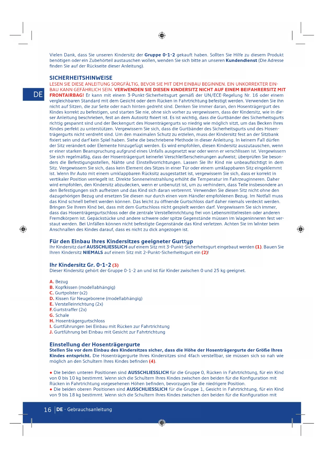 Vielen Dank, dass Sie unseren Kindersitz der Gruppe 0-1-2 gekauft haben. Sollten Sie Hilfe zu diesem Produkt benötigen oder ein Zubehörteil austauschen wollen, wenden Sie sich bitte an unseren Kundendienst (Die Adresse finden Sie auf der Rückseite dieser Anleitung). SICHERHEITSHINWEISE LESEN SIE DIESE ANLEITUNG SORGFÄLTIG, BEVOR SIE MIT DEM EINBAU BEGINNEN. EIN UNKORREKTER EIN- BAU KANN GEFÄHRLICH SEIN. VERWENDEN SIE DIESEN KINDERSITZ NICHT AUF EINEM BEIFAHRERSITZ MIT FRONTAIRBAG! Er kann mit einem 3-Punkt-Sicherheitsgurt gemäß der UN/ECE-Regelung Nr. 16 oder einem vergleichbaren Standard mit dem Gesicht oder dem Rücken in Fahrtrichtung befestigt werden. Verwenden Sie ihn nicht auf Sitzen, die zur Seite oder nach hinten gedreht sind. Denken Sie immer daran, den Hosenträgergurt des Kindes korrekt zu befestigen, und starten Sie nie, ohne sich vorher zu vergewissern, dass der Kindersitz, wie in die- ser Anleitung beschrieben, fest an dem Autositz fixiert ist. Es ist wichtig, dass die Gurtbänder des Sicherheitsgurts richtig gespannt sind und der Beckengurt des Hosenträgergurts so niedrig wie möglich sitzt, um das Becken Ihres Kindes perfekt zu unterstützen. Vergewissern Sie sich, dass die Gurtbänder des Sicherheitsgurts und des Hosen- trägergurts nicht verdreht sind. Um den maximalen Schutz zu erzielen, muss der Kindersitz fest an der Sitzbank fixiert sein und darf kein Spiel haben. Siehe die beschriebene Methode in dieser Anleitung. In keinem Fall dürfen der Sitz verändert oder Elemente hinzugefügt werden. Es wird empfohlen, diesen Kindersitz auszutauschen, wenn er einer starken Beanspruchung aufgrund eines Unfalls ausgesetzt war oder wenn er verschlissen ist. Vergewissern Sie sich regelmäßig, dass der Hosenträgergurt keinerlei Verschleißerscheinungen aufweist; überprüfen Sie beson- ders die Befestigungsstellen, Nähte und Einstellvorrichtungen. Lassen Sie Ihr Kind nie unbeaufsichtigt in dem Sitz. Vergewissern Sie sich, dass kein Element des Sitzes in einer Tür oder einem umklappbaren Sitz eingeklemmt ist. Wenn Ihr Auto mit einem umklappbaren Rücksitz ausgestattet ist, vergewissern Sie sich, dass er korrekt in vertikaler Position verriegelt ist. Direkte Sonneneinstrahlung erhöht die Temperatur im Fahrzeuginneren. Daher wird empfohlen, den Kindersitz abzudecken, wenn er unbenutzt ist, um zu verhindern, dass Teile insbesondere an den Befestigungen sich aufheizen und das Kind sich daran verbrennt. Verwenden Sie diesen Sitz nicht ohne den dazugehörigen Bezug und ersetzen Sie diesen nur durch einen vom Händler empfohlenen Bezug. Im Notfall muss das Kind schnell befreit werden können. Das leicht zu öffnende Gurtschloss darf daher niemals verdeckt werden. Bringen Sie Ihrem Kind bei, dass mit dem Gurtschloss nicht gespielt werden darf. Vergewissern Sie sich immer, dass das Hosenträgergurtschloss oder die zentrale Verstelleinrichtung frei von Lebensmittelresten oder anderen Fremdkörpern ist. Gepäckstücke und andere schwere oder spitze Gegenstände müssen im Wageninneren fest ver- staut werden. Bei Unfällen können nicht befestigte Gegenstände das Kind verletzen. Achten Sie im Winter beim Anschnallen des Kindes darauf, dass es nicht zu dick angezogen ist. Für den Einbau Ihres Kindersitzes geeigneter Gurttyp Ihr Kindersitz darf AUSSCHLIESSLICH auf einem Sitz mit 3-Punkt-Sicherheitsgurt eingebaut werden (1). Bauen Sie Ihren Kindersitz NIEMALS auf einem Sitz mit 2-Punkt-Sicherheitsgurt ein (2)! Ihr Kindersitz Gr. 0-1-2 (3) Dieser Kindersitz gehört der Gruppe 0-1-2 an und ist für Kinder zwischen 0 und 25 kg geeignet. A. Bezug B. Kopfkissen (modellabhängig) C. Gurtpolster (x2) D. Kissen für Neugeborene (modellabhängig) E. Verstelleinrichtung (2x) F. Gurtstraffer (2x) G. Schale H. Hosenträgergurtschloss