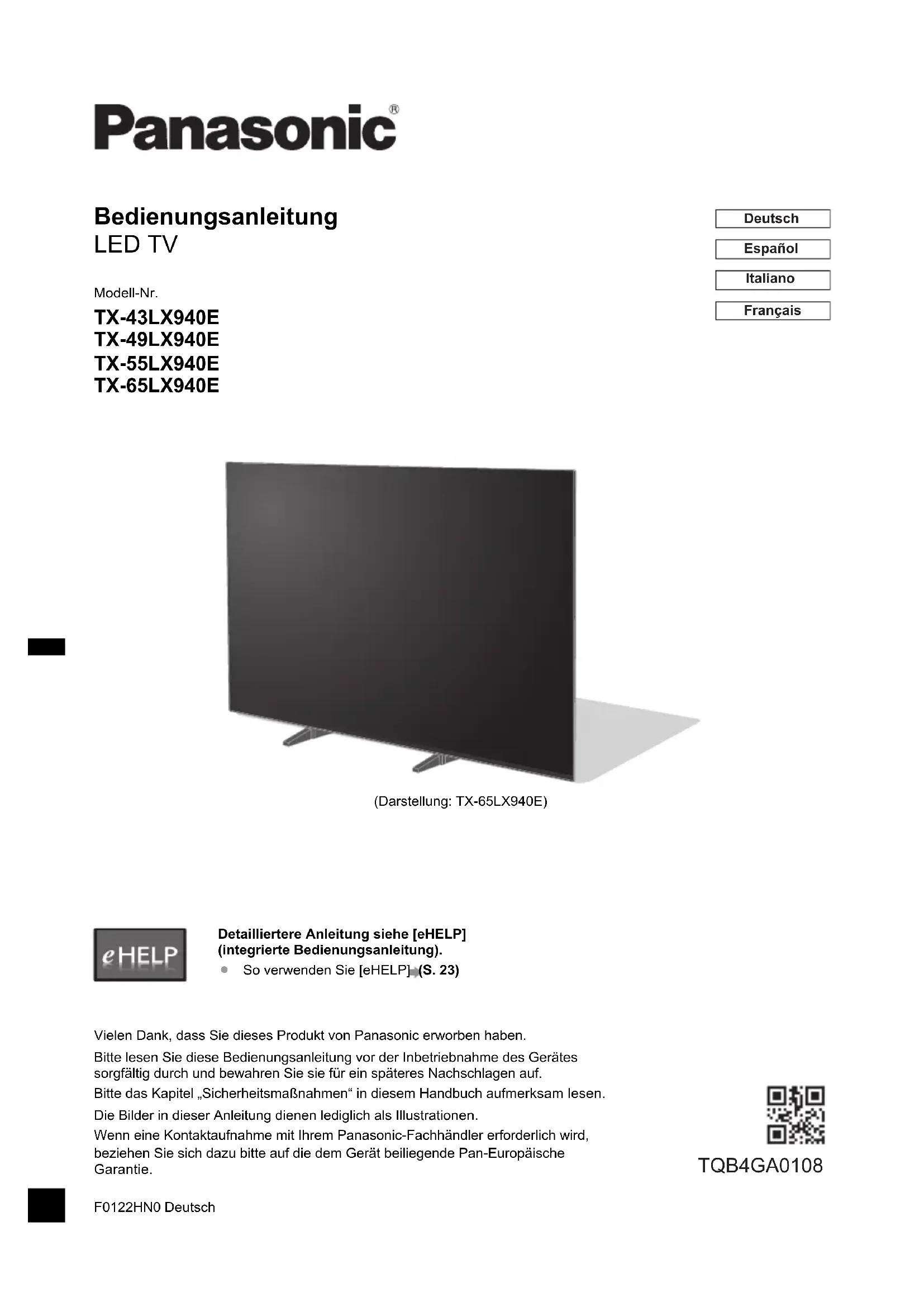 (Darstellung: TX-65LX940E) Bedienungsanleitung LED TV Modell-Nr. TX-43LX940E TX-49LX940E TX-55LX940E TX-65LX940E Detailliertere Anleitung siehe [eHELP] (integrierte Bedienungsanleitung). ≥ So verwenden Sie [eHELP] (S. 23) Vielen Dank, dass Sie dieses Produkt von Panasonic erworben haben. Bitte lesen Sie diese Bedienungsanleitung vor der Inbetriebnahme des Gerätes sorgfältig durch und bewahren Sie sie für ein späteres Nachschlagen auf. Bitte das Kapitel „Sicherheitsmaßnahmen“ in diesem Handbuch aufmerksam lesen. Die Bilder in dieser Anleitung dienen lediglich als Illustrationen. Wenn eine Kontaktaufnahme mit Ihrem Panasonic-Fachhändler erforderlich wird, beziehen Sie sich dazu bitte auf die dem Gerät beiliegende Pan-Europäische Garantie. F0122HN0 Deutsch Deutsch Español Italiano Français TQB4GA0108 TX-43_49_55_65LX940E_TQB4GA0108_ger.book 1 ページ 2022年1月12日 水曜日 午後5時56分2 Deutsch Inhaltsverzeichnis Bitte unbedingt lesen Wichtiger Hinweis ················································ 4 Sicherheitsmaßnahmen ········································ 5 Mitgeliefertes Zubehör ·········································· 9 Aufstellung des Fernsehers ··································10 Wandhalterungsmontage ·····································12 Anschlüsse ·······················································13 Anordnung der Bedienelemente ····························18 Erstmalige automatische Einrichtung ······················22 Betrachten von Fernsehprogrammen ······················23 Verwendung von eHELP ······································23 Häufig gestellte Fragen ········································24 Pflege und Instandhaltung ····································25 Technische Daten ···············································26 TX-43_49_55_65LX940E_TQB4GA0108_ger.book 2 ページ 2022年1月12日 水曜日 午後5時56分3 Deutsch Die Begriffe HDMI, HDMI High-Definition Multimedia Interface sowie das HDMI-Logo sind Marken oder eingetragene Marken von HDMI Licensing Administrator, Inc. Dolby, Dolby Vision, Dolby Vision IQ, Dolby Atmos, Dolby Audio und das Doppel-D-Symbol sind Marken von Dolby Laboratories Licensing Corporation. In Lizenz von Dolby Laboratories gefertigt. Vertrauliche unveröffentlichte Werke. Copyright © 1992-2021 Dolby Laboratories. Alle Rechte vorbehalten. WPA3™, WPA2™, WPA™ sind Warenzeichen von Wi-Fi Alliance