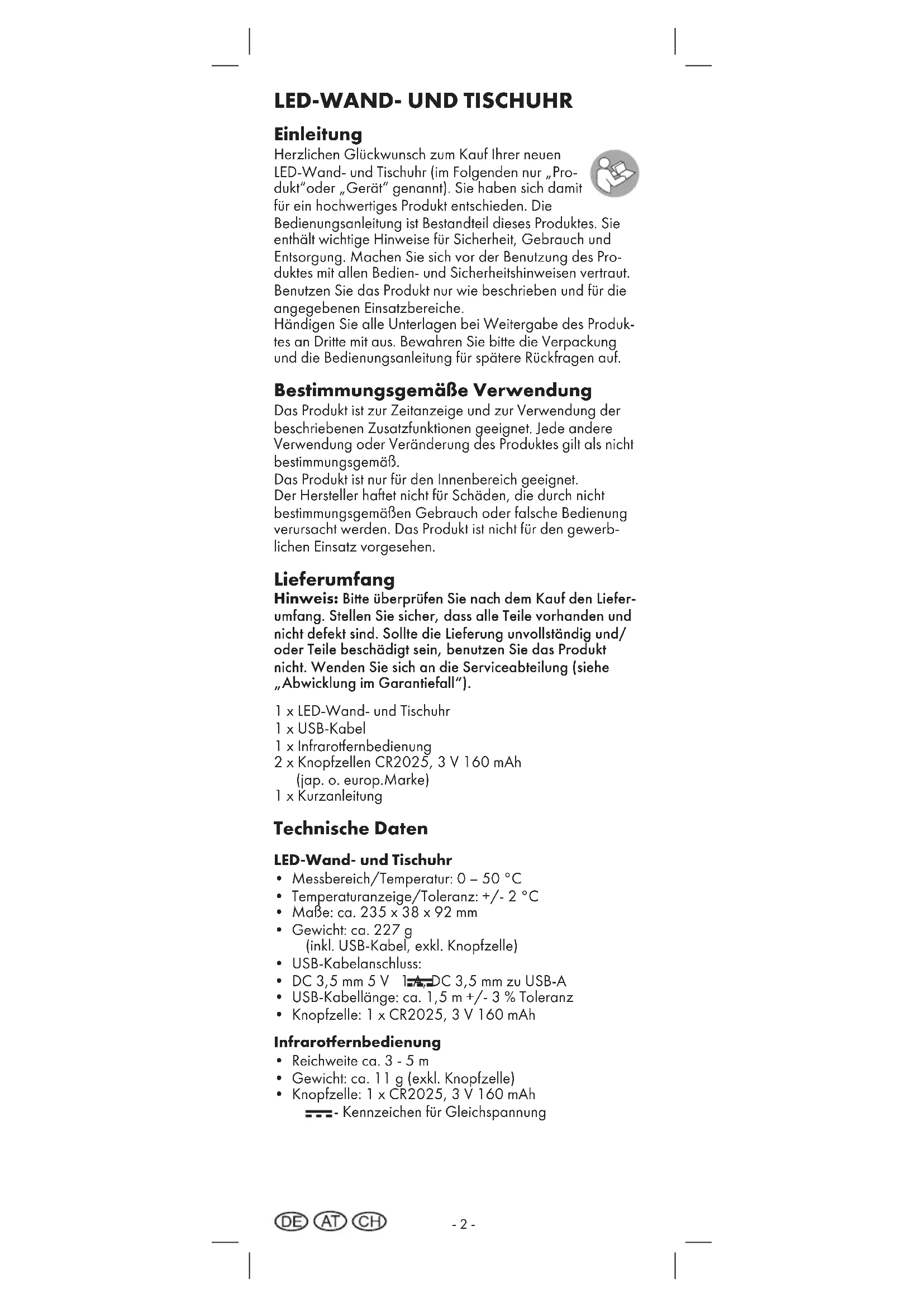 Einleitung Herzlichen Glückwunsch zum Kauf Ihrer neuen LED-Wand- und Tischuhr (im Folgenden nur „Pro- dukt“oder „Gerät“ genannt). Sie haben sich damit für ein hochwertiges Produkt entschieden. Die Bedienungsanleitung ist Bestandteil dieses Produktes. Sie enthält wichtige Hinweise für Sicherheit, Gebrauch und Entsorgung. Machen Sie sich vor der Benutzung des Pro- duktes mit allen Bedien- und Sicherheitshinweisen vertraut. Benutzen Sie das Produkt nur wie beschrieben und für die angegebenen Einsatzbereiche. Händigen Sie alle Unterlagen bei Weitergabe des Produk- tes an Dritte mit aus. Bewahren Sie bitte die Verpackung und die Bedienungsanleitung für spätere Rückfragen auf. Bestimmungsgemäße Verwendung Das Produkt ist zur Zeitanzeige und zur Verwendung der beschriebenen Zusatzfunktionen geeignet. Jede andere Verwendung oder Veränderung des Produktes gilt als nicht bestimmungsgemäß. Das Produkt ist nur für den Innenbereich geeignet. Der Hersteller haftet nicht für Schäden, die durch nicht bestimmungsgemäßen Gebrauch oder falsche Bedienung verursacht werden. Das Produkt ist nicht für den gewerb- lichen Einsatz vorgesehen. Lieferumfang Hinweis: Bitte überprüfen Sie nach dem Kauf den Liefer- umfang Stellen Sie sicher, dass alle Teile vorhanden und nicht defekt sind Sollte die Lieferung unvollständig und/ oder Teile beschädigt sein, benutzen Sie das Produkt nicht Wenden Sie sich an die Serviceabteilung (siehe „Abwicklung im Garantiefall“) 1 x LED-Wand- und Tischuhr 1 x USB-Kabel 1 x Infrarotfernbedienung 2 x Knopfzellen CR2025, 3 V 160 mAh (jap. o. europ.Marke) 1 x Kurzanleitung Technische Daten LED-Wand- und Tischuhr